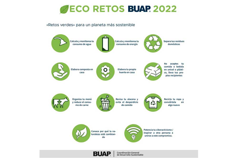 La relación que guarda el hombre con la naturaleza exige cambios inmediatos que frenen el daño al medio ambiente. Como comunidad universitaria, las acciones proactivas y colectivas son parte de la formación integral de los estudiantes; por ello, la Dirección de Gestión Ambiental, de la Coordinación General de Desarrollo Sustentable, invita a sumarse a los Eco Retos BUAP 2022, para abonar a un planeta más sostenible. Esta campaña está pensada para que desde el resguardo que exige la pandemia, las pequeñas acciones que de manera personal o familiar se realicen tengan un impacto inmediato. Entre estas destacan 12 eco retos, los cuales se realizarán uno por semana. Lee también: Distingue a la prepa Lázaro Cárdenas de la BUAP la educación de calidad La iniciativa arranca este martes 8 de febrero y entre los eco retos destacan el cálculo de la huella ambiental, separación de residuos domésticos, elaboración de composta, creación de tu propio huerto en casa, organización de menús para reducir el consumo de carne, y cómo usar los propios recipientes para evitar el empleo de plástico o unicel, entre otras acciones vinculadas al cuidado del medio ambiente. Para participar es necesario mantenerse activo en las siguientes redes sociales Facebook: @DG.ambientalBUAP, Instagram: direcciondegestion o twitter @dgambientalbuap, a fin de realizar las consignas planteadas y compartir las experiencias que permitan interactuar y enriquecer este ejercicio de conciencia ambiental. La dinámica de los eco retos BUAP incluye la publicación de infografías, videos, experiencias y datos, a fin de que los participantes conozcan sobre temas ambientales, hacer conciencia e intercambiar experiencias con otras personas que también se comprometen con el cuidado del entorno natural. No olviden compartir esta iniciativa con todos sus conocidos y sobre todo participar, para inspirar a otros a unirse a este compromiso que atiende los momentos críticos que vive el planeta, porque cada acción repercute a mediano y largo plazo.