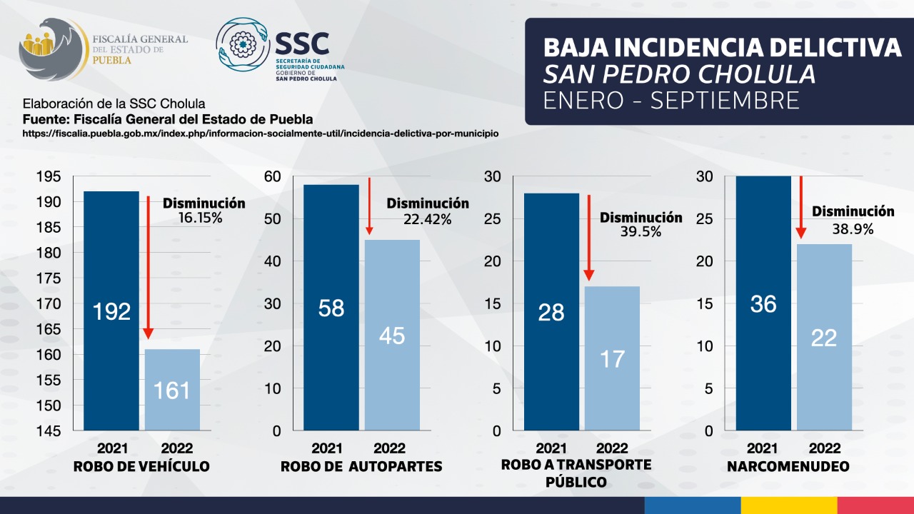 Respecto a las carpetas de investigación abiertas en este año, San Pedro Cholula es el único municipio de la zona metropolitana en registrar este avance, debido a que el resto de las demarcaciones reportaron -en promedio- un incremento de 7.33%. De los resultados de este reporte, se desprende que las estrategias implementadas por la Secretaría de Seguridad Ciudadana (SSC Cholula) han permitido reducciones importantes en delitos de alto impacto entre enero y septiembre de 2022, en comparación al mismo periodo de 2021. Las reducciones en robo de vehículo fueron de 16.15%; en robo de autopartes, se registró una disminución de 22.42%; en robo a negocio registró una baja de 3.6%; los homicidios se redujeron 33.4%, mientras que el narcomenudeo reportó una baja de 38.9%. Asimismo, derivado de los operativos de pasajero y movilidad segura, se han logrado inhibir delitos a bordo de unidades del transporte público, logrando reducir 39.5% los incidentes. Lee también: Robo de mercancía en carreteras afecta economía de empresas Cabe destacar que el reporte de incidencia delictiva emitido por la Fiscalía General del Estado de Puebla, es información de carácter público y puede consultarse en la página: https://fiscalia.puebla.gob.mx/index.php/informacion-socialmente-util/incidencia-delictiva-por-municipio Con estas acciones, el Gobierno Municipal encabezado por la presidenta Paola Angon, refrenda su compromiso con la ciudadanía para continuar implementando estrategias que permitan brindar tranquilidad a las familias cholultecas. |