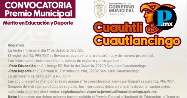 El gobierno municipal invita a la ciudadanía a participar en la convocatoria para obtener el “Premio Cuauhtli Cuautlancingo”, con el que se reconocerá el mérito de quienes han sobresalido en los ámbitos educativo y deportivo en la comunidad. El premio será de 20 mil pesos más la entrega de un reconocimiento. Las categorías serán las siguientes: Educación: