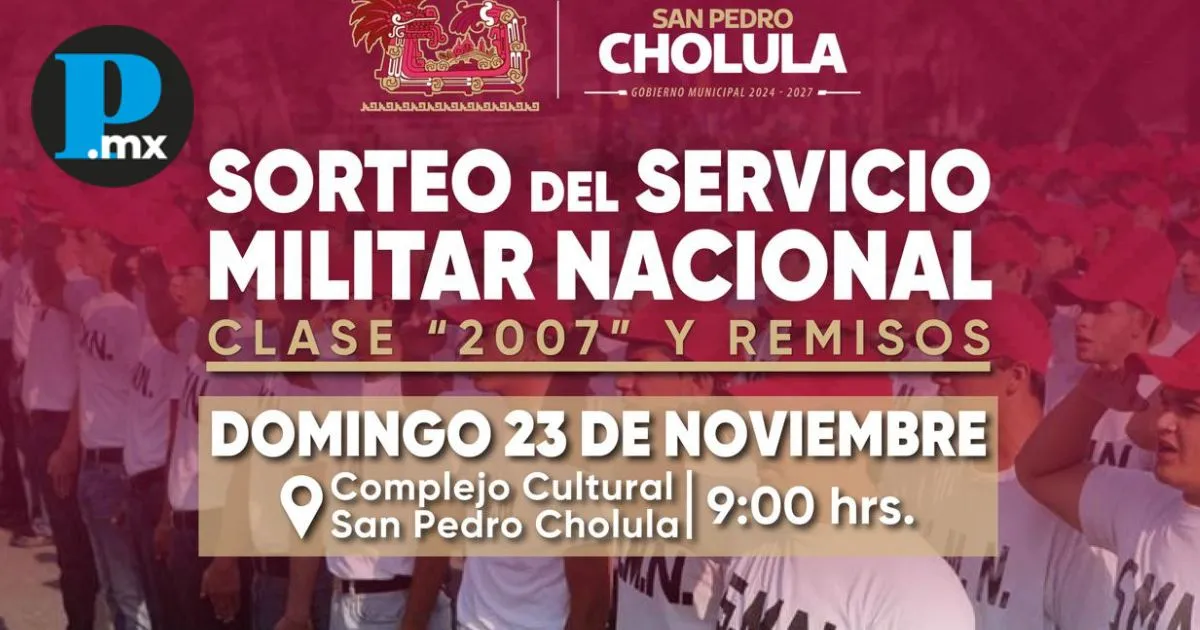 El Gobierno Municipal de San Pedro Cholula, presidido por Tonantzin Fernández, invita a los varones nacidos en 2007 al Sorteo del Servicio Militar Nacional, que se realizará el próximo 23 de noviembre a las 09:00 horas en el Complejo Cultural.