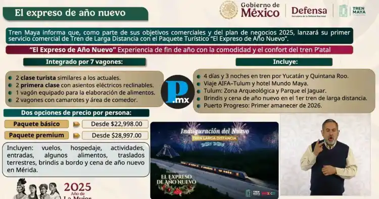 Tren Maya, Mundo Maya y Mexicana de Aviación presentaron sus paquetes turísticos para el cierre de 2025, que incluyen recorridos por el sureste mexicano, hospedaje en hoteles administrados por la Secretaría de la Defensa Nacional (Sedena) y traslados aéreos con la aerolínea operada igualmente por la dependencia. Durante la conferencia matutina de la presidenta Claudia Sheinbaum Pardo, el general Óscar Lozano, responsable de Tren Maya, informó que se ofrecerán diez paquetes principales, entre ellos recorridos por diversas lagunas de Quintana Roo y visitas a zonas arqueológicas. Resaltó que el Tren Maya lanzará su primer servicio comercial de larga distancia con el paquete turístico “El Expreso de Año Nuevo”, una experiencia de cuatro días y tres noches a bordo del tren P'atal que recorrerá Yucatán y Quintana Roo. El paquete incluye el viaje AIFA–Tulum, hospedaje en un hotel Mundo Maya, recorridos por la zona arqueológica de Tulum y el Parque El Jaguar, un brindis y cena de Año Nuevo, así como la visita a Puerto Progreso para apreciar el primer amanecer de 2026. El convoy estará integrado por siete vagones: dos de clase turista, dos de primera clase, con asientos eléctricos reclinables, un vagón cocina y dos vagones con camarotes y comedor. El costo del paquete básico será de 22 mil 998 pesos por persona, mientras que la versión premium ascenderá a 28 mil 997 pesos. Ambos incluyen vuelos, hospedaje, traslados terrestres, actividades guiadas, entradas a sitios turísticos, algunos alimentos, brindis a bordo y la cena de fin de año en Mérida. Te puede interesar: En 2026, poblanxs ganarán 36 pesos más diarios y, en 2030, trabajarán 8 horas menos El general Tonatiuh Velasco informó que los hoteles del grupo Mundo Maya cuentan con categoría de cuatro estrellas y señaló que, durante julio, registraron más de nueve mil turistas y en agosto superaron los diez mil. Con los paquetes de fin de año esperan incrementar sus niveles de ocupación. Por su parte, el director de Mexicana de Aviación, Leonardo Ávila, señaló que la aerolínea mantiene tarifas entre 18 y 22 por ciento inferiores al promedio nacional y que para esta temporada se habilitarán precios especiales. Un ejemplo es la Ruta de las Maravillas (Mérida–Chichén Itzá–Valladolid–Mérida), con un costo individual de 17 mil 095 pesos. En total, se pondrán a la venta 20 paquetes con disponibilidad del 2 de diciembre al 20 de enero de 2026, cuyos precios máximos alcanzan 26 mil 826 pesos por persona. Entre ellos destacan: Corazón de los Antiguos, Paraíso del Mayab, Tierra del Jaguar, Mares y Lagunas, Santuario Maya, Ruta de las Maravillas, Entre Pirámides y Palmeras, Entre Lagunas y Leyendas y Alma Libre en el Caribe. |
