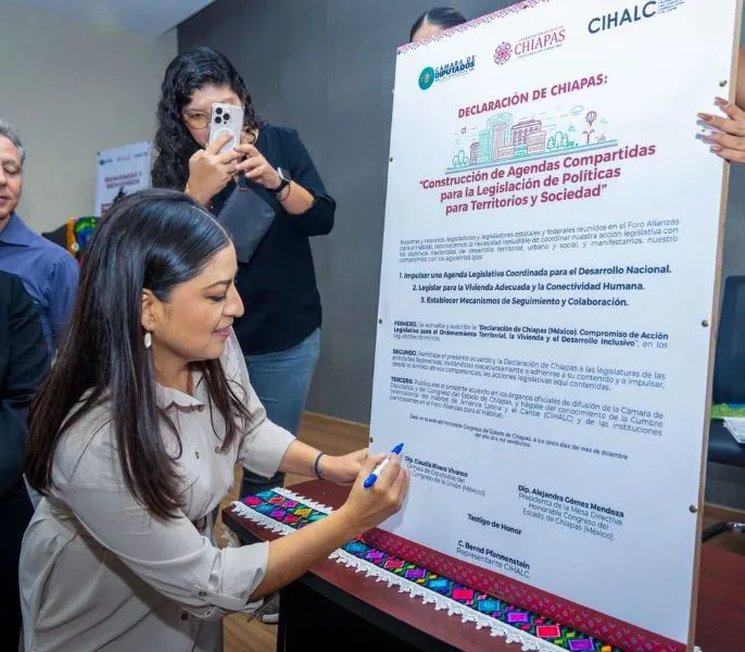Autoridades del Congreso del Estado de Chiapas firmaron la “Declaración de Chiapas”, un acuerdo que busca impulsar una agenda conjunta entre el Congreso federal y el Congreso local para legislar en materia de vivienda adecuada y conectividad humana. El documento fue suscrito en el marco del Foro “Alianzas para el Hábitat–Construyendo Agendas para Territorios y Sociedad”, con la presencia de legisladores, gobiernos y organizaciones de la sociedad civil. La firma estuvo encabezada por la diputada federal Claudia Rivera Vivanco; por la diputada Alejandra Gómez Mendoza, presidenta de la Mesa Directiva del Congreso chiapaneco; por Mario Francisco Guillén Guillén, presidente de la Junta de Coordinación Política; así como por Bernd Pfannestrin, director ejecutivo de la Cumbre Internacional del Hábitat en América Latina y el Caribe. Te puede interesar: Claudia Rivera pide a estados sumarse al plan de seguridad nacional Durante su intervención, la diputada Claudia Rivera, integrante del Grupo Parlamentario de Morena en San Lázaro, recordó que el propósito central del acuerdo es apoyar el diseño de nuevas políticas de vivienda, movilidad y desarrollo sostenible, a 10 años de Hábitat III y de la Nueva Agenda Urbana. “Tenemos el reto y la responsabilidad de ponernos de acuerdo, y para ello necesitamos tener claros nuestros canales de comunicación y fortalecer nuestros vínculos de confianza. Trabajemos para diseñar caminos y estrategias que nos permitan seguir construyendo en lo colectivo”, puntualizó. Por su parte, la diputada Alejandra Gómez Mendoza explicó que durante el foro se analizaron diversos marcos legales y modelos de financiamiento para ampliar el acceso a la vivienda digna. Agregó que también se revisaron temas sobre ciudades inclusivas, movilidad sostenible, integración de sistemas de transporte público, peatonal y no motorizado; así como la importancia de nuevas leyes para reducir emisiones, fortalecer la economía popular y garantizar prosperidad compartida. “El objetivo de todo esto es que de aquí se generen grandes resultados que se conviertan en una buena política pública, con la ayuda de todas y de todos ustedes y que se traduzca en diversas propuestas e iniciativas con el respaldo del Congreso Federal”, indicó.