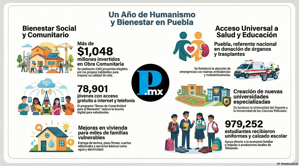 El Primer Informe de Gobierno 2025 del Estado de Puebla concentra sus mayores avances en el Eje del Humanismo con Bienestar, que aglutina la principal inversión social y el mayor número de beneficiarios directos. De acuerdo con un análisis cualitativo y cuantitativo realizado por El Popular, periodismo con causa, al documento público del informe que consta de más 600 páginas, durante el primer año de la administración encabezada por Alejandro Armenta Mier, se ejecutaron 4,192 proyectos de Obra Comunitaria, definidos mediante asambleas ciudadanas en 160 municipios considerados Zonas de Atención Prioritaria, con una inversión total de 1,048 millones de pesos. También puedes leer: Armenta presume avances en seguridad, bienestar y obra en su primer informe Estas acciones involucraron a 20,960 personas en comités comunitarios, de las cuales 67% fueron mujeres. En materia educativa, destaca el Programa de Becas de Conectividad para el Bienestar, que reporta una inversión de 90.4 millones de pesos, beneficiando a 78,901 estudiantes de nivel medio superior y superior en 204 municipios, mediante acceso gratuito a telefonía móvil e internet. El informe señala que este programa generó un ahorro económico directo para las familias beneficiarias. El sector salud es otro de los rubros que presenta resultados cuantificables. Puebla se ubicó en cuarto lugar nacional en donación cadavérica de órganos, quinto en trasplantes de córnea y sexto en trasplantes renales, además del fortalecimiento de la atención prehospitalaria con ambulancias y motoambulancias con cobertura en siete macrorregiones del estado.