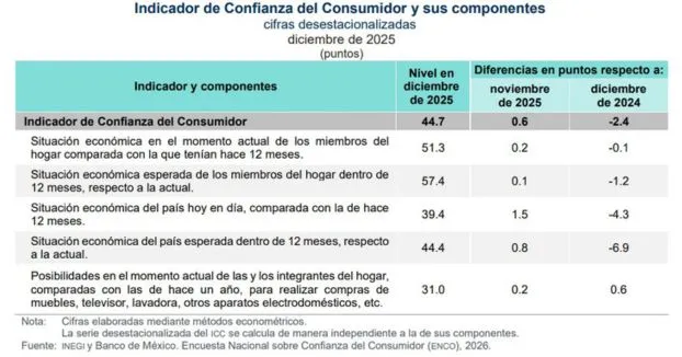 El Indicador de Confianza del Consumidor repuntó en diciembre de 2025 con avances mensuales en sus cinco componentes; sin embargo, a tasa anual mantiene una caída, de acuerdo con cifras del Instituto Nacional de Estadística y Geografía (Inegi) y el Banco de México, ajustadas por estacionalidad. El Indicador de Confianza del Consumidor (ICC) se ubicó en 44.7 puntos en diciembre de 2025, lo que representó un incremento mensual de 0.6 puntos. Pese a este avance mensual, el indicador registró una disminución anual de 2.4 puntos respecto a diciembre de 2024, reflejando una menor confianza de los hogares frente al cierre del año anterior. Al interior del índice y con cifras desestacionalizadas, se reportaron incrementos mensuales en los cinco componentes que integran el ICC, aun cuando persiste entre los hogares una percepción de incertidumbre económica, asociada a los cambios en el entorno comercial y la escalada de aranceles.