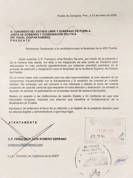 El exauditor Francisco Romero Serrano declinó a continuar en el proceso de selección para la titularidad de la Auditoría Superior del Estado (ASE), al argumentar el inicio de nuevos proyectos. A través de un escrito, el extitular de la ASE, encarcelado en el gobierno de Miguel Barbosa Huerta, informó a la Junta de Gobierno y Coordinación Política (Jugocopo) del Congreso de Puebla que tomó la decisión de declinar a la candidatura. Te puede interesar: Congreso de Puebla analizará 11 perfiles para encabezar la ASE Señaló que fue un honor haber sido considerado para tan alta responsabilidad, la cual requiere de un compromiso inquebrantable con la transparencia y la rendición de cuentas en la entidad. Sin embargo, dijo que, por así convenir a sus intereses y debido al inicio de nuevos proyectos de carácter personal que requieren de su total atención y dedicación, tomó la decisión de declinar su participación en el proceso, de manera irrevocable.