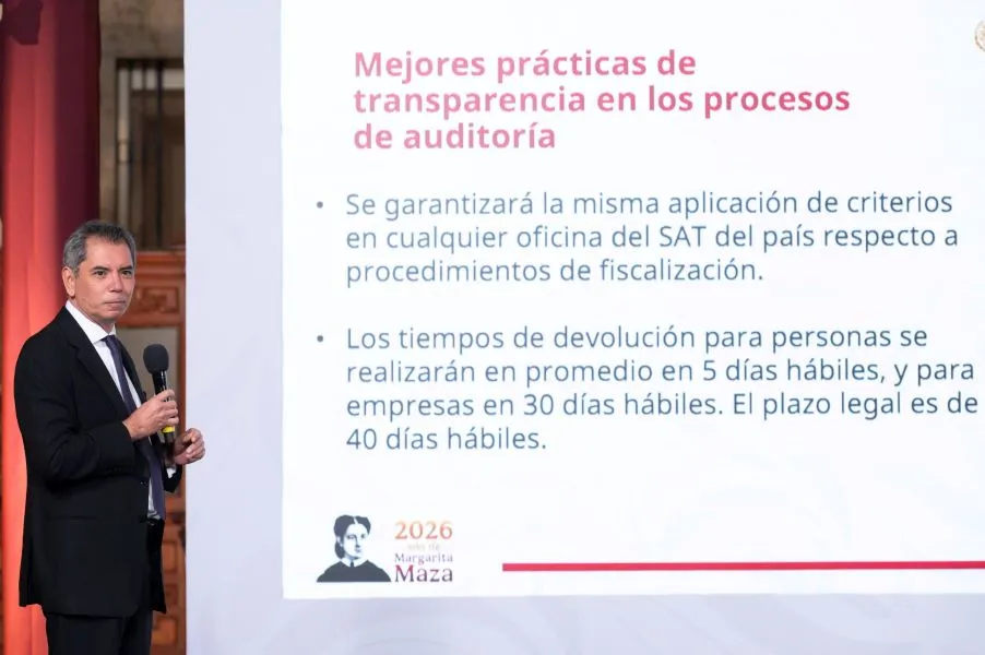 La mandataria federal destacó que el incremento en los ingresos públicos representa recursos adicionales para el financiamiento de los Programas para el Bienestar, así como para obras públicas, salud y educación. Asimismo, subrayó que la recaudación ha mostrado una tendencia al alza desde 2019. Por su parte, el secretario de Hacienda y Crédito Público (SHCP), Edgar Amador Zamora, informó que para 2026 se estima una recaudación total de 6 billones 448 mil millones de pesos, lo que significaría un aumento real de 4.6 por ciento. Añadió que se implementarán “Mejores prácticas de transparencia en los procesos de auditoría”, publicadas el 5 de enero, que contemplan, entre otros puntos, la realización de una sola auditoría por contribuyente en caso de incumplimiento, la revisión de muestras y no de la totalidad de la información, y la homologación de criterios de fiscalización en todas las oficinas del SAT. El documento también establece que los tiempos promedio de devolución de impuestos serán de cinco días hábiles para personas físicas y de 30 días hábiles para personas morales, cuando el plazo legal es de hasta 40 días hábiles.