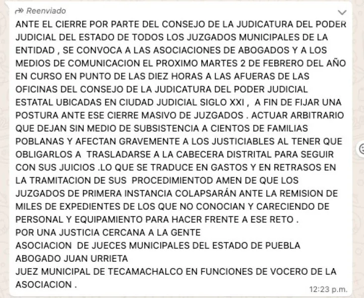 La Asociación de Jueces Municipales del Estado de Puebla se pronunció en contra del cierre masivo de juzgados municipales por parte del Consejo de la Judicatura del Poder Judicial, al señalar que habrá afectaciones, retrasos y colapso. Juan Urrieta Urrieta, abogado y juez municipal de Tecamachalco en funciones de vocero de dicha agrupación, convocó a asociaciones de abogados y medios de comunicación el próximo martes 3 de febrero a las 10:00 horas para fijar una postura sobre el cierre de los juzgados. El posicionamiento se llevará a cabo en las afueras del Consejo de la Judicatura del Poder Judicial del Estado, ubicado en Ciudad Judicial Siglo XXI, en Anillo Periférico Ecológico, Arcos del Sur, San Bernardino Tlaxcalancingo. Te puede interesar: Poder Judicial destinará 331 millones de pesos a servicios de alimentación en 2026 La convocatoria señala que el cierre masivo de juzgados municipales es un acto arbitrario que deja sin medio de subsistencia a cientos de familias poblanas, afecta gravemente a los justiciables, quienes se verán obligados a trasladarse a la cabecera distrital para continuar con sus juicios, lo cual se traduce en gastos y en demoras en la tramitación de sus procedimientos. Además, advierte que los juzgados de primera instancia colapsarán ante la remisión de miles de expedientes que no conocen, pues carecen de personal y equipo para hacer frente a estos cambios. “Por una justicia cercana a la gente. Asociación de Jueces Municipales del Estado de Puebla. Abogado Juan Urrieta, juez municipal de Tecamachalco en funciones de vocero de la asociación”, se lee en la misiva. ![]() El pasado 23 de enero, el Consejo de la Judicatura del Poder Judicial del Estado de Puebla publicó el acuerdo por el que se determina la conclusión de funciones, ordenando el cierre definitivo de los juzgados municipales de Chinantla, Atlixco y Cuautlancingo. Asimismo, instruye el traslado de los asuntos en trámite y ejecución al Juzgado de lo Civil y de lo Penal del Distrito Judicial de Acatlán, al Juzgado de lo Civil del Distrito Judicial de Atlixco y al Juzgado Primero de lo Civil del Distrito Judicial de Cholula, respectivamente. Previamente, se ordenó el cierre de los juzgados de Quimixtlán, San Nicolás Buenos Aires, Zacapoaxtla, Tepeyahualco, Ixtepec y Aljojuca, por la reestructuración interna para optimizar recursos y centralizar la administración de justicia. |