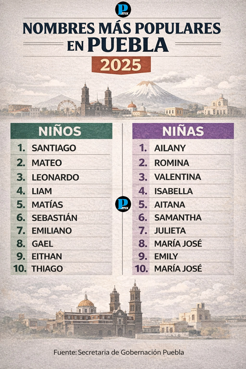 En 2025, las familias poblanas dejaron atrás los nombres tradicionales al momento de registrar a sus hijas e hijos ante el Registro Civil de Puebla. Entre las preferencias destacaron Ailany y Santiago, quienes encabezaron las listas de los diez nombres más utilizados para niñas y niños, respectivamente. El listado de los 10 nombres más elegidos por poblanas y poblanos deja ver un cambio generacional. Las nuevas madres y padres ya no recurren a los clásicos María, Guadalupe, José o Juan; ahora predominan opciones más actuales en el caso de las niñas, como Valentina. También puedes leer: Enfrentan infancias de Puebla, discriminación y letargo institucional En el caso de los niños, persiste una marcada presencia de nombres bíblicos como Santiago, así como algunos de origen extranjero, como Liam. Así lo indicó la Secretaría de Gobernación (SEGOB) de Puebla en la solicitud de información 761204426000005.