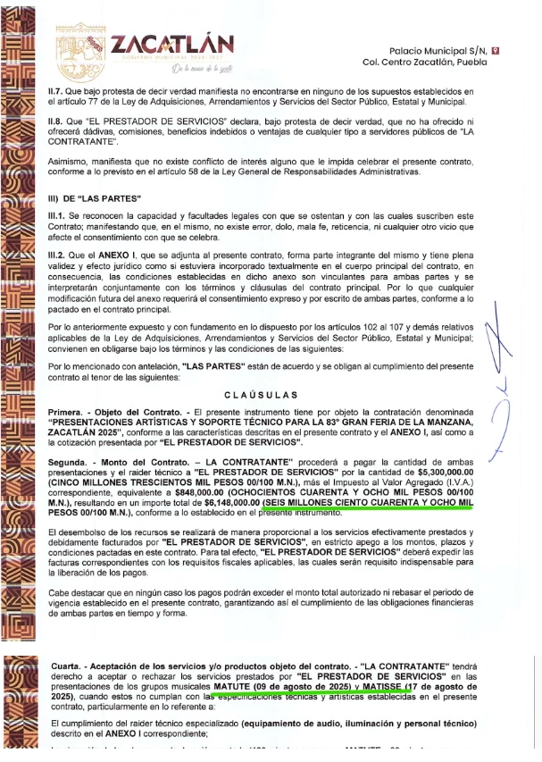 “La información solicitada, aun cuando ésta se encuentra en posesión de este H. Ayuntamiento, el procesamiento y reproducción de los documentos, sobrepasa las capacidades técnicas y de recursos humanos de este Sujeto Obligado para dar atención a su solicitud en los plazos establecidos”. Durante la consulta directa, personal del área señaló además que otros contratos aún no habían sido cargados en la Plataforma Nacional de Transparencia, pues pronto estarían en el portal; sin embargo, no se emitió aviso alguno para informar que la información ya se encontraba publicada desde el 30 de enero de este año. Madera, manzanas y demás gastos millonarios de la Feria de Zacatlán 2025Los 8 millones 790 mil 258 pesos ejercidos por el Ayuntamiento de Zacatlán para la realización de la Gran Feria de la Manzana 2025 no solo se destinaron a los conciertos de Matute y Matisse, que concentraron el 69.9 por ciento del presupuesto, sino también a una amplia lista de servicios y suministros. Entre los servicios y artículos para realizar la feria se encuentra un evento musical organizado por Radio Lobo 96.7 F.M., arreglos florales, renta de sillas y carpas, servicio de catering —alimentos, bebidas y meseros— para la presentación de la Reina de la Feria, así como la compra de cajas de manzanas, madera y otros insumos utilizados durante el festejo. En el caso de las conciertos de Matute y Matisse, el costo para que ambas agrupaciones se presentaran en Zacatlán fue de 6 millones 148 mil pesos, según el contrato PMZP/CMA/2025/100-1 que se le entregó por adjudicación directa a José Alejandro Barrera Eulogio, organizador de eventos con sede en Texcaltepec, Hidalgo.