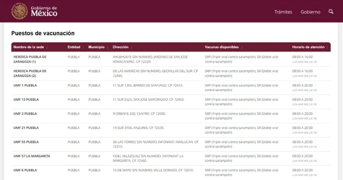 Ante el aumento de casos de sarampión en la entidad y en todo el país, las autoridades de salud han intensificado la campaña de vacunación, poniendo a disposición de la población más de mil puntos de vacunación gratuitos en Puebla para prevenir la propagación del virus. La mayoría de los puntos de aplicación de vacunas en el estado operan de lunes a viernes, en un horario de 8:00 a 15:30 horas; sin embargo, este puede variar según la sede. El Gobierno de México habilitó la plataforma ¿Dónde me vacuno? como una herramienta digital que permite a la ciudadanía consultar los centros de salud, hospitales y puestos de inmunización donde se encuentra disponible la vacuna contra el sarampión. A través de este sitio se puede seleccionar el tipo de vacuna, la entidad, el municipio y el grupo de edad en el que se encuentra la persona interesada en aplicarse una dosis, para ubicar las direcciones, días y horarios de atención de los módulos de salud en los 217 municipios de Puebla. Te puede interesar: Puebla confirma 66 casos de sarampión; hay 370 mil vacunas En el municipio de Puebla, las autoridades sanitarias dispusieron de 73 puntos de vacunación distribuidos en centros de salud de la Secretaría de Salud, así como en los Centros de Salud con Servicios Ampliados (CESSA) del IMSS-Bienestar. Entre ellos se encuentran, por ejemplo, el Hospital General del Sur, el Hospital de la Mujer, el Cessa de Xonacatepec, el Hospital de la Margarita, la Delegación Estatal ISSSTE Puebla, el Mercado Hidalgo, el Mercado Morelos y la Tienda 3B Paseos del Bosque.