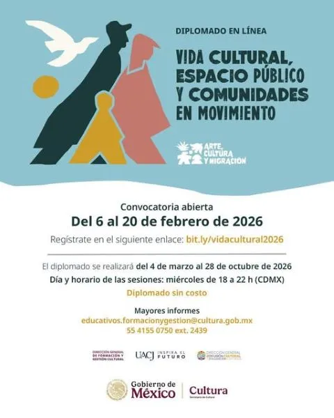 La Secretaría de Cultura, a través del Gobierno de México, presentó el diplomado virtual “Vida cultural, espacio público y comunidades en movimiento”, una propuesta académica sin costo dirigida a la formación de agentes culturales que trabajen en contextos de movilidad humana y diversidad cultural. El programa se desarrollará del 4 de marzo al 28 de octubre de 2026 y estará conformado por cinco módulos, enfocados en fortalecer los derechos culturales y promover la inclusión, la no discriminación, el antirracismo, la sostenibilidad y el trabajo colaborativo entre instituciones y comunidades, bajo un enfoque intercultural, territorial y de derechos humanos. Te puede interesar: Sheinbaum propone actualizar Ley de Cine y regular uso de IA en doblaje de voz El diplomado está dirigido a gestores culturales, artistas, activistas, docentes, personas servidoras públicas e integrantes de organizaciones culturales y comunitarias que laboren en contextos de movilidad. ¿Qué se necesita para ingresar?Para postularse, las personas interesadas deberán completar un formulario en línea y presentar un escrito libre de 2 a 3 cuartillas con una propuesta de tema o proyecto vinculado a comunidades en movimiento. La convocatoria permanecerá abierta hasta el 20 de febrero. Además, deberán contar con equipo de cómputo o tableta con cámara y sonido, acceso a internet, así como manejo de Zoom y Google Classroom. Para acreditar el diplomado se requiere un mínimo de 80 por ciento de asistencia, entrega total de tareas, participación en actividades y un proyecto final con promedio mínimo de 8.0. ![]() Los módulos que se impartirán son: