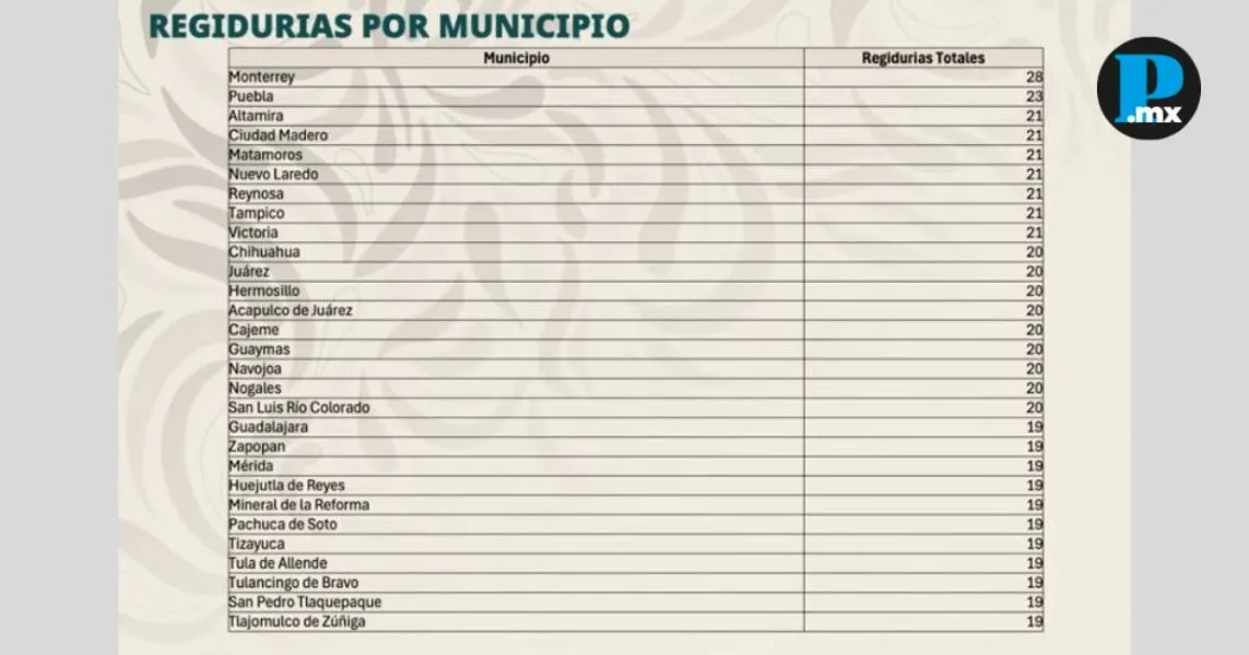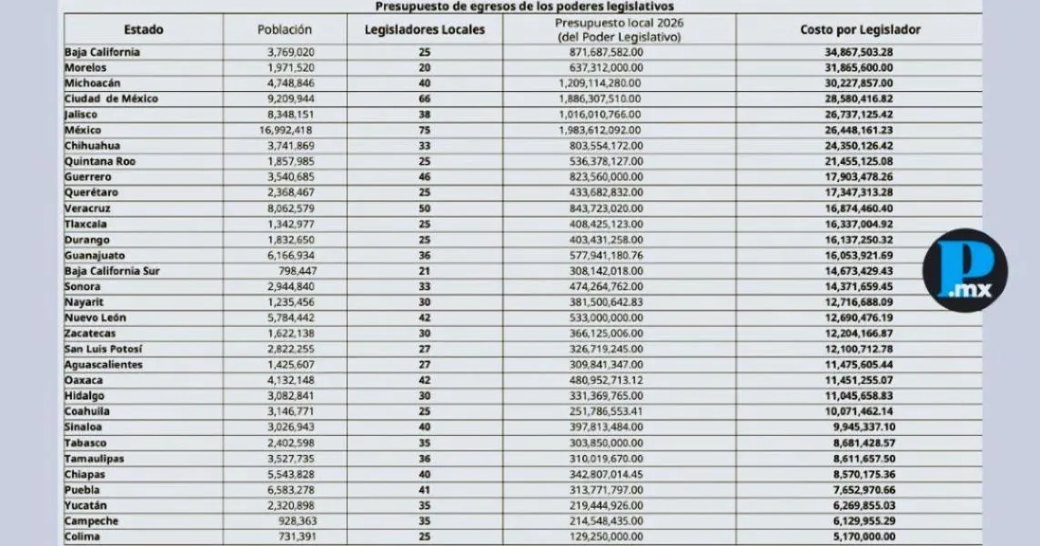 En contraste, las entidades con los congresos más caros por legislador son Baja California Sur, donde cada uno de sus 21 representantes cuesta 34 millones 867 mil 503 pesos; Morelos, con 31 millones 865 mil 600 pesos por cada uno de sus 20 diputados. También Michoacán, donde los 40 legisladores tienen un costo de 30 millones 227 mil 857 pesos cada uno; Ciudad de México, que destina 28 millones 580 mil 416 pesos para sus 66 integrantes; y Jalisco, donde cada uno de sus 38 diputados representa un gasto de 26 millones 737 mil 125 pesos. Cabe recordar que, de acuerdo con la Ley de Egresos 2026 del Estado de Puebla, el Poder Judicial cuenta con un presupuesto de mil 463 millones 658 mil 338 pesos, mientras que el Poder Ejecutivo tiene asignados 38 millones 846 mil 952 pesos, monto que contempla servicios personales, materiales y suministros, así como servicios generales del titular del Ejecutivo. Sheinbaum plantea reducir regidores; Puebla destaca con 23Claudia Sheinbaum Pardo, también presentó una tabla con los municipios con mayor número de regidurías en el país, en la que el municipio de Puebla aparece en segundo lugar con 23 regidores, solo por debajo de Monterrey, que cuenta con 28. Durante su exposición, la mandataria señaló que el elevado número de regidores en algunos ayuntamientos responde a prácticas políticas del pasado, en las que estos cargos se utilizaban como “pago de cuotas” dentro de los partidos.