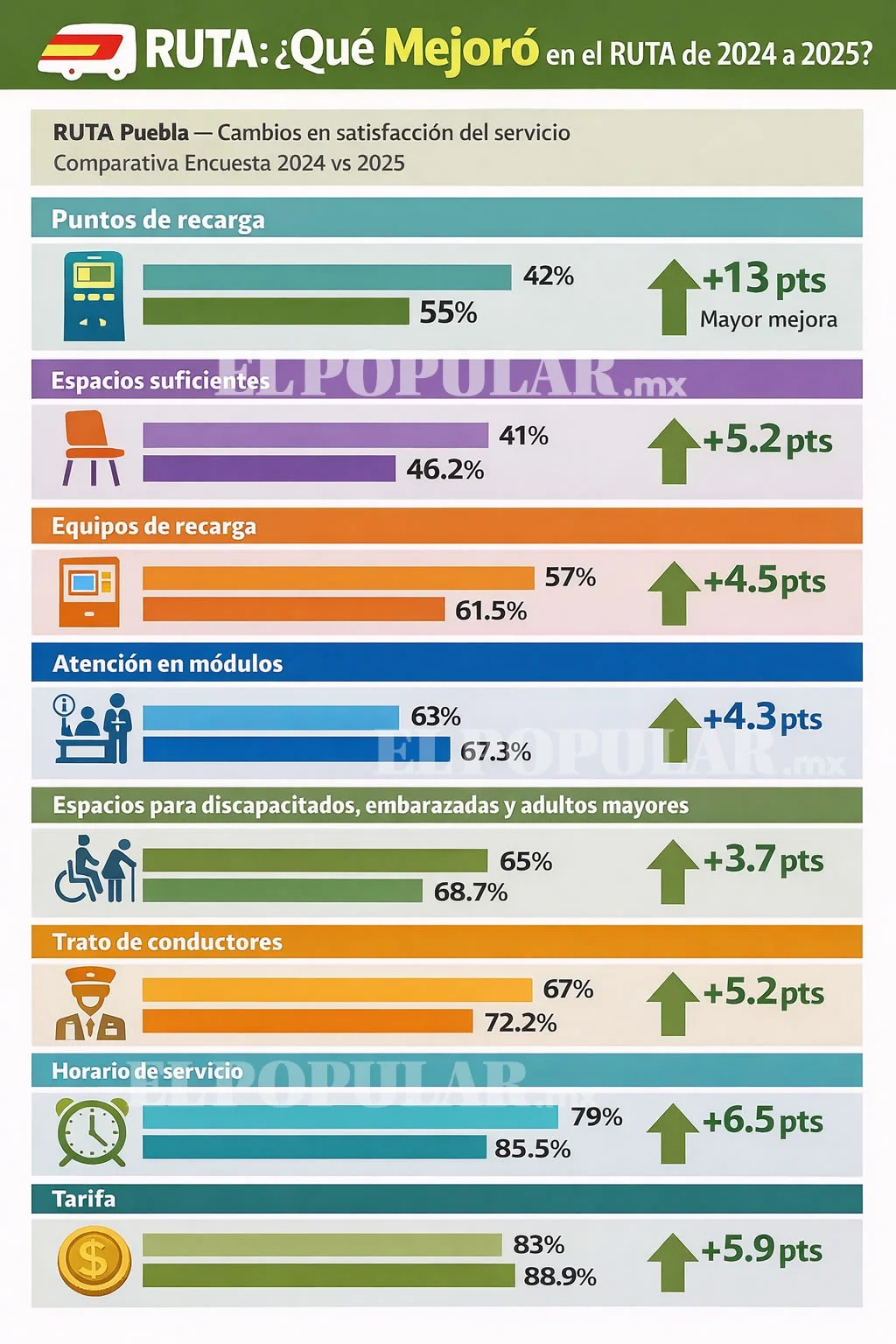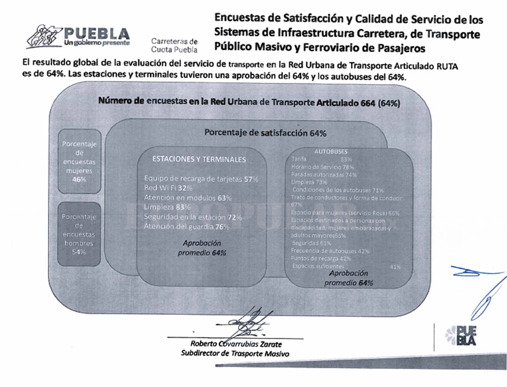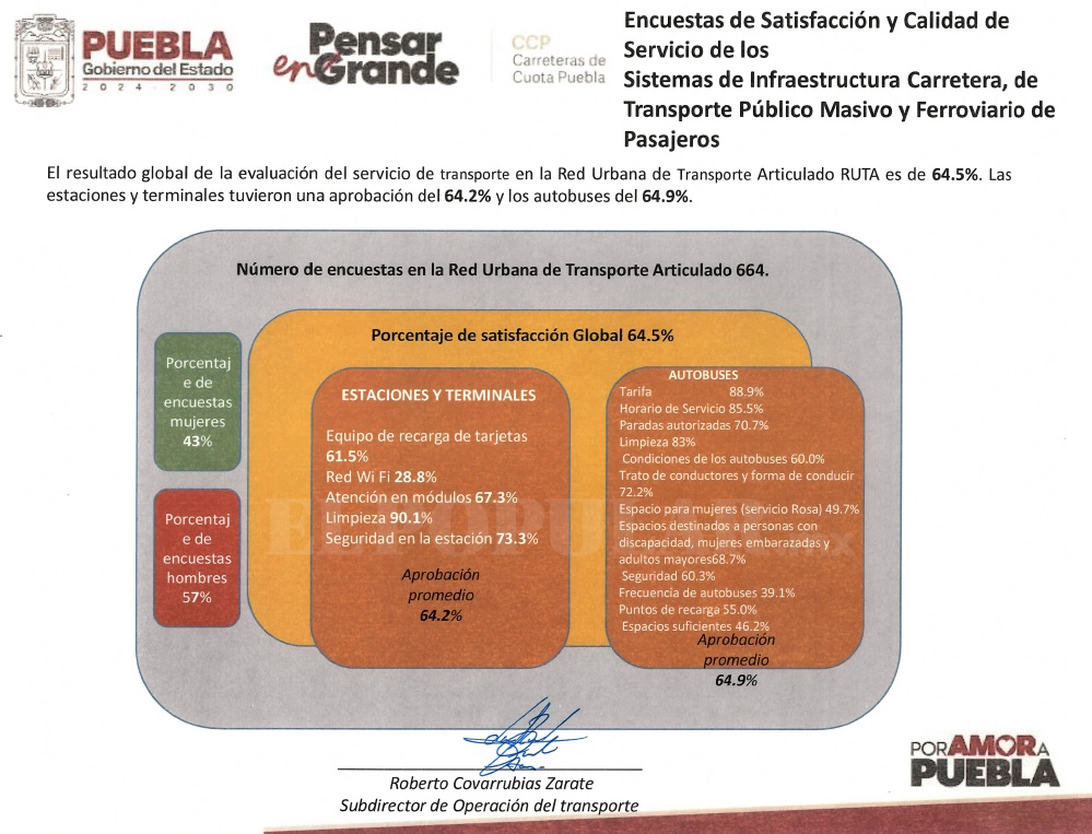 En la Encuesta de Satisfacción y Calidad del Servicio de 2025, la calificación general de 64.5 por ciento es el resultado de 17 rubros que calificaron 664 usuarios que viajan con frecuencia en el metrobús o en las unidades alimentadoras para trasladarse por diversos puntos de la ciudad de Puebla. Más información: RUTA registra alza de 3.6% en pasajeros y 19.1% en kilómetros recorridos durante 2025 La calificación general del servicio del RUTA aumentó cinco décimas en comparación con el resultado de 2024, ya que tanto la operación del metrobús, sus estaciones de acceso y las rutas alimentadoras lograron una aprobación de 64 por ciento, de acuerdo con los documentos obtenidos por las solicitudes de información 210420325000003 y 760420326000002. En ese año, los rubros reprobados fueron el equipo de recarga de las tarjetas, el WiFi, la frecuencia de los autobuses, los puntos de recarga y la falta de espacio suficiente para tomar asiento o permanecer de pie en las unidades.