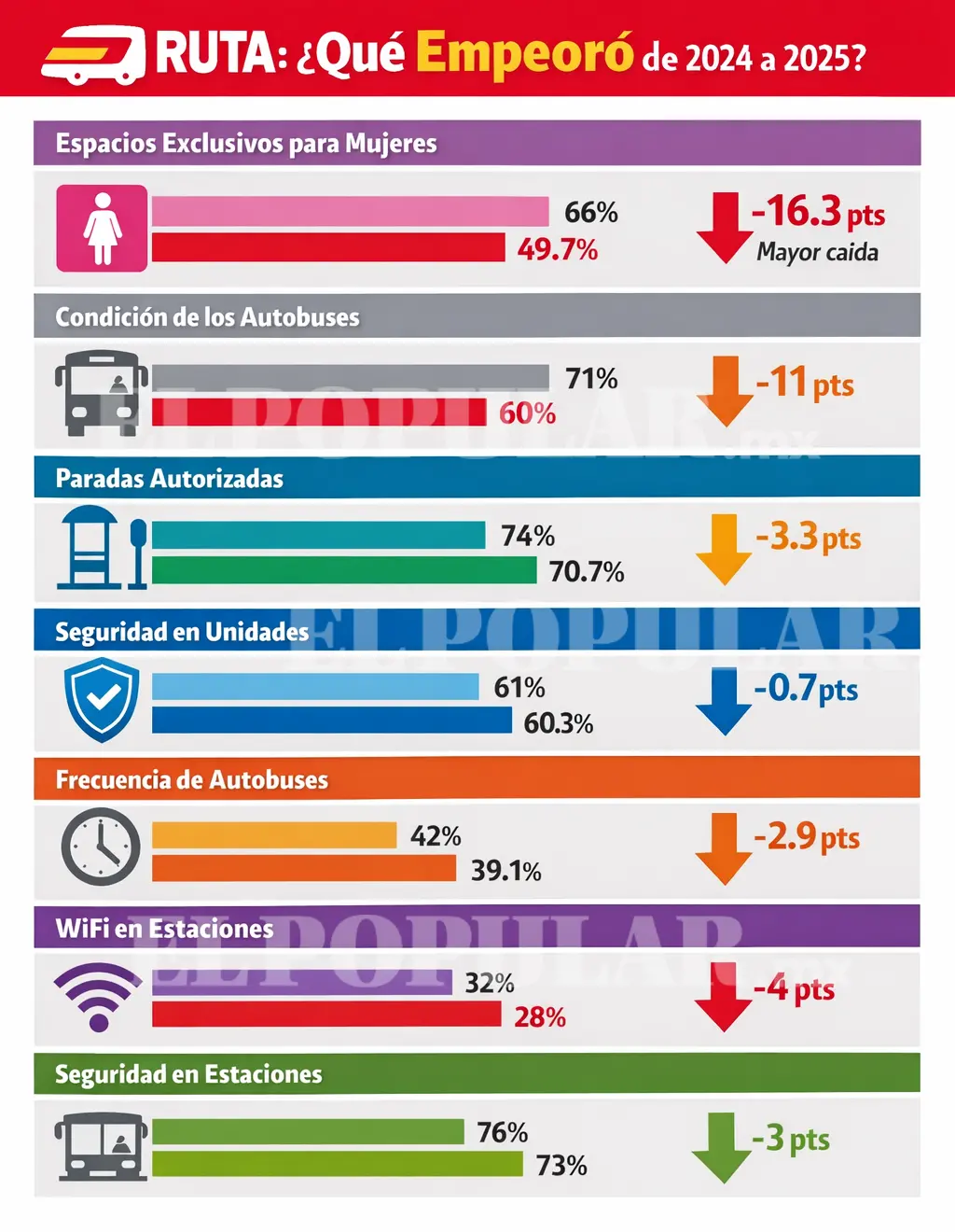 En el caso de las unidades alimentadoras y de metrobús, las paradas autorizadas, los espacios para mujeres (servicio rosa), la seguridad, la condición de los autobuses y la frecuencia de autobuses fueron los aspectos que bajaron en la percepción de calidad. Las paradas autorizadas pasaron de 74 a 70.7 por ciento; los espacios para mujeres tenían una calificación de 66 y pasaron a 49.7 por ciento; la seguridad contaba con una aprobación de 61 y ahora cuenta con 60.3 por ciento. La condición de los autobuses ahora tiene 60 por ciento, pues perdió 11 puntos de satisfacción; las paradas de autobuses contaban con 74 y pasaron a 70.7 por ciento, y la frecuencia de autobuses pasó de 42 a 39.1 por ciento.