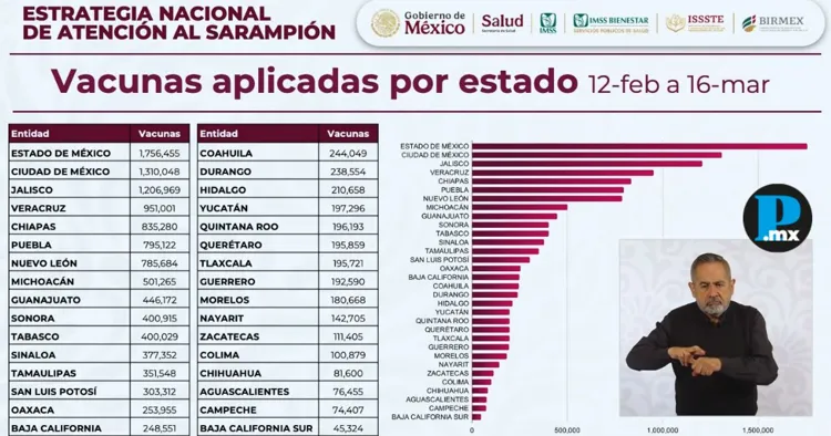En el estado de Puebla, se han aplicado 795 mil 122 vacunas contra el sarampión tras cinco semanas de campaña masiva, informó el gobierno federal. La entidad ocupa el sexto lugar nacional en alcance de inmunización, como resultado de la jornada realizada del 12 de febrero al 16 de marzo. A pesar de estos avances, autoridades sanitarias pidieron reforzar la vacunación en Puebla, así como en Durango, Sonora y Quintana Roo, debido a que la tendencia a la baja en contagios aún no se considera completamente estable. Te puede interesar: Puebla es prioridad nacional en vacunación contra el sarampión La Secretaría de Salud reportó que, desde el inicio de la Estrategia Nacional de Vacunación contra el sarampión, se han inmunizado 13.3 millones de personas en todo el país. Este avance ha contribuido a una reducción cercana al 30 por ciento en los casos activos, al comparar la última semana con el repunte registrado entre el 21 y el 24 de febrero, explicó Eduardo Clark García Dobarganes, subsecretario de Integración y Desarrollo del Sector Salud.