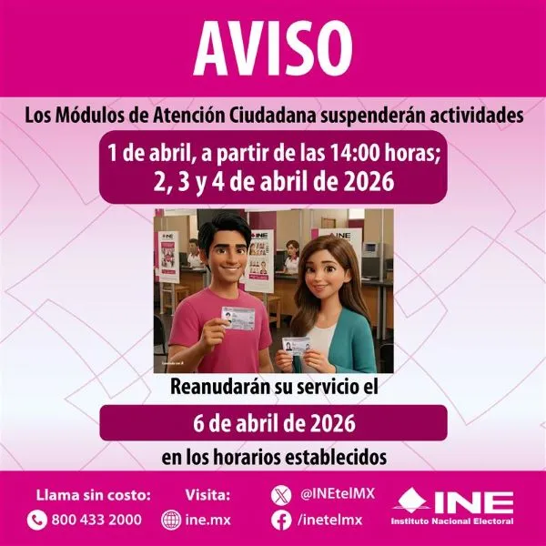 El Instituto Nacional Electoral (INE) anunció la suspensión temporal de actividades en sus Módulos de Atención Ciudadana en Puebla con motivo del periodo de Semana Santa. De acuerdo con información difundida en redes sociales, los módulos permanecerán cerrados los días 2, 3 y 4 de abril de 2026, por lo que no recibirán a la ciudadanía durante ese periodo. Te puede interesar: INE multa con 9.8 millones de pesos a partidos políticos en Puebla Además, el 1 de abril, los módulos operarán con un ajuste en su horario, ya que cerrarán a las 14:00 horas, es decir, una hora antes de lo habitual. Las actividades se reanudarán el 6 de abril de 2026, cuando los módulos volverán a brindar servicio en su horario regular de lunes a sábado, de 8:00 a 15:00 horas. ![]() El INE recomendó a la población tomar previsiones ante esta suspensión temporal, en especial para quienes requieren realizar trámites relacionados con su credencial para votar. |