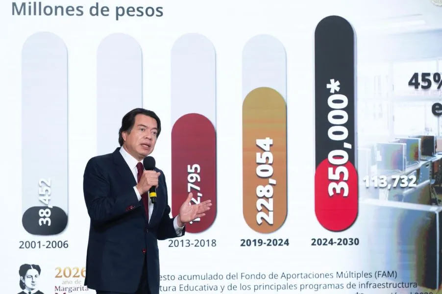 El secretario de Educación Pública (SEP), Mario Delgado Carrillo, explicó que, de los 350 mil mdp que se invertirán en todo el sexenio, 113 mil 732 mdp corresponden a lo que se destinará este año. Además, señaló que, de la inversión total, el 45 por ciento corresponde al programa La Escuela es Nuestra (LEEN). Los recursos también se destinan a la meta de crear 200 mil nuevos lugares; para ello, expuso, se invierten más de 13 mil mdp para más de 500 acciones en educación Media Superior en 2026, mientras que en 2025 fueron 88 acciones. Además, la inversión en la Universidad Rosario Castellanos (UNRC) durante 2026 será de 1.2 mil mdp en los estados de Baja California, Baja California Sur, Estado de México, Campeche, Guerrero, Michoacán, Nayarit, Quintana Roo, Sinaloa, Sonora y Zacatecas. En 2026 se estima destinar 26 mil mdp al programa La Escuela es NuestraLa directora general del programa La Escuela es Nuestra, Pamela López Ruiz, informó que en 2026 se estima destinar 26 mil mdp para acciones de mejoramiento en 75 mil 405 escuelas, en beneficio de 8.5 millones de estudiantes. Detalló que, de las escuelas beneficiadas, 69 mil 385 corresponden a educación Básica y 6 mil 30 a Media Superior; además, se han realizado 72 mil 349 asambleas, lo que representa un avance de 96 por ciento de la meta proyectada.