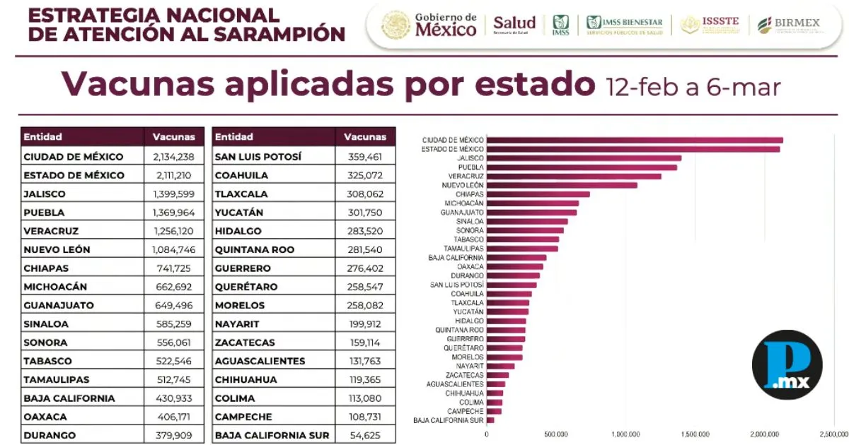 La vacunación contra el sarampión avanza en México, previo a que la Organización Panamericana de la Salud (OPS) evalúe el próximo 13 de abril si el país mantiene la categoría de libre de esta enfermedad. Durante la conferencia de la presidenta Claudia Sheibaum Pardo, el gobierno informó que se registra una reducción en los casos diarios gracias a la campaña de inmunización. Te puede interesar: Vacunación contra sarampión contiene propagación en México: Secretaria de Salud En Puebla, se aplicaron 148 mil 171 dosis en una semana, lo que coloca a la entidad en cuarto lugar con mayor cobertura a nivel nacional. Entre el 12 de febrero y el 4 de abril, se han aplicado un total de un millón 369 mil 964 vacunas en la entidad. De acuerdo con Eduardo Clark García Dobarganes, subsecretario de Integración Sectorial y Desarrollo de la Secretaría de Salud, la campaña ha contribuido a un descenso en los contagios de sarampión. El informe diario del brote al 6 de abril reporta 15 mil 209 casos confirmados en todo el país, concentrados principalmente en Jalisco y Chihuahua.