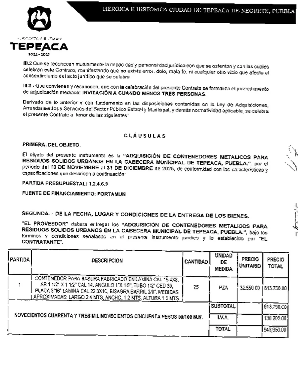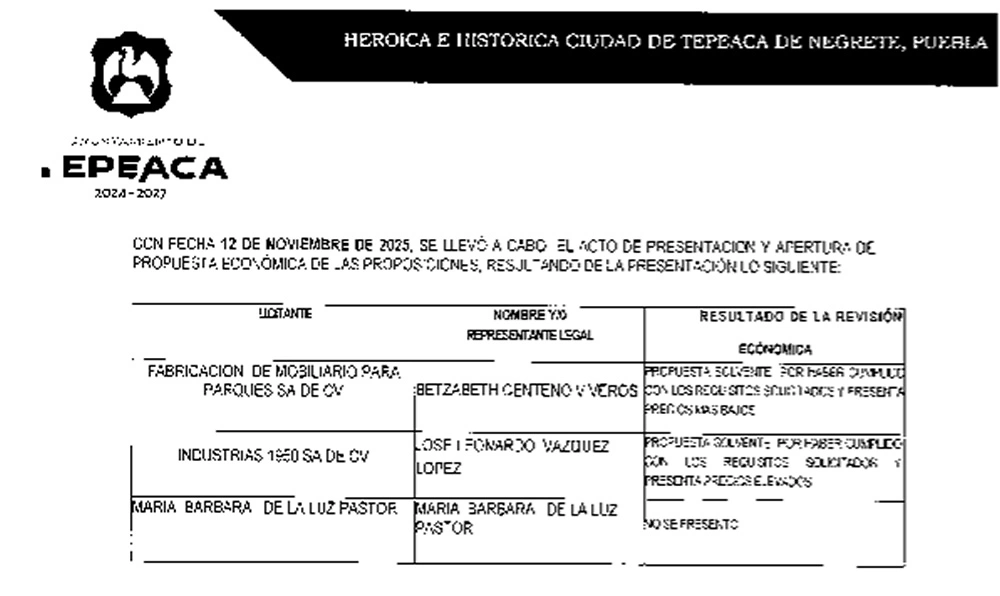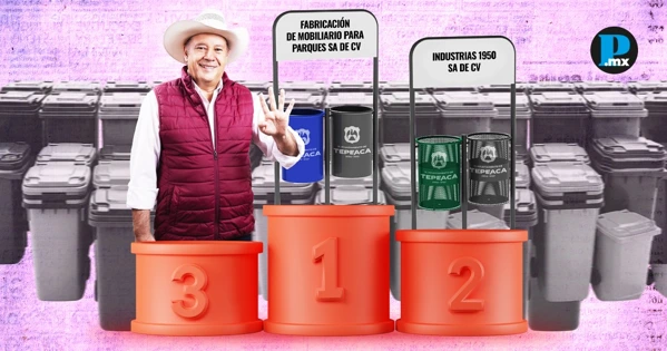 A simple vista, los nuevos contenedores de basura que compró la administración de Alfredo Velázquez Romero en Tepeaca sólo forman parte del nuevo mobiliario urbano; sin embargo, su adquisición se resolvió en una licitación donde una empresa, cuya sede está en el mismo municipio, compitió contra sí misma para quedarse con el contrato de casi un millón de pesos. También puedes leer: Grupo Farrelle, empresa favorita de Atlixco acumula 14 millones en 4 años La compañía ganadora fue Fabricación de Mobiliario para Parques S.A. de C.V., que compitió contra Industrias 1950 S.A. de C.V.. Ambas razones sociales pertenecen a Betzabeth Centeno Viveros, originaria de Tepeaca; así lo indican los datos del Registro Público de Comercio (RPC), la Plataforma Nacional de Transparencia (PNT) y el oficio 760441626000002 solicitado por El Popular al Ayuntamiento de Tepeaca. Las dos empresas de Betzabeth Centeno fueron invitadas por el Ayuntamiento de Tepeaca para competir entre sí por el contrato de 25 contenedores de basura, cuyo costo unitario fue de 37 mil 758 pesos, según los documentos del proceso de compra MTP-DRM-INV-2025-076, organizado en noviembre de 2025. Incluso, el Comité de Adjudicaciones, órgano encargado de emitir las invitaciones y en el que Alfredo Romero funge como presidente, invitó como tercer competidor a María Bárbara de la Luz Pastor, proveedora que fue descalificada el 12 de noviembre de 2025 por no presentar una cotización.