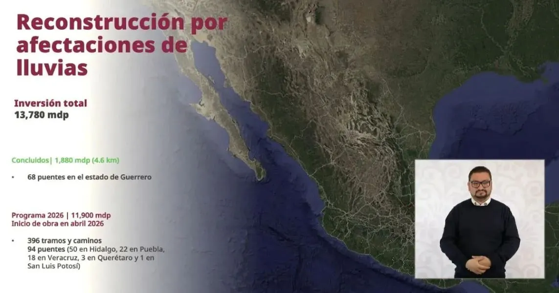 El Gobierno de México iniciará este mes las obras de reconstrucción de 22 puentes en la Sierra Norte de Puebla, los cuales resultaron afectados por las lluvias registradas en octubre de 2025. Durante su conferencia de prensa, la presidenta Claudia Sheinbaum Pardo informó que la rehabilitación de carreteras y puentes dañados en entidades como Veracruz e Hidalgo se mantendrá hasta lograr la habilitación total de la infraestructura. Te puede interesar: Avanza obra Cuautla-Tlapa en Tehuitzingo y Acatlán de Osorio: SICT Explicó que el arranque de los trabajos se retrasó debido a la necesidad de cumplir con etapas previas, como la elaboración de proyectos ejecutivos y los procesos de licitación. Por su parte, el titular de la Secretaría de Infraestructura, Comunicaciones y Transportes (SICT), Jesús Antonio Esteva Medina, detalló que el programa contempla la intervención de 396 tramos y caminos, así como 94 puentes distribuidos en distintos estados: Hidalgo (50), Puebla (22), Veracruz (18), Querétaro (3) y San Luis Potosí (1).