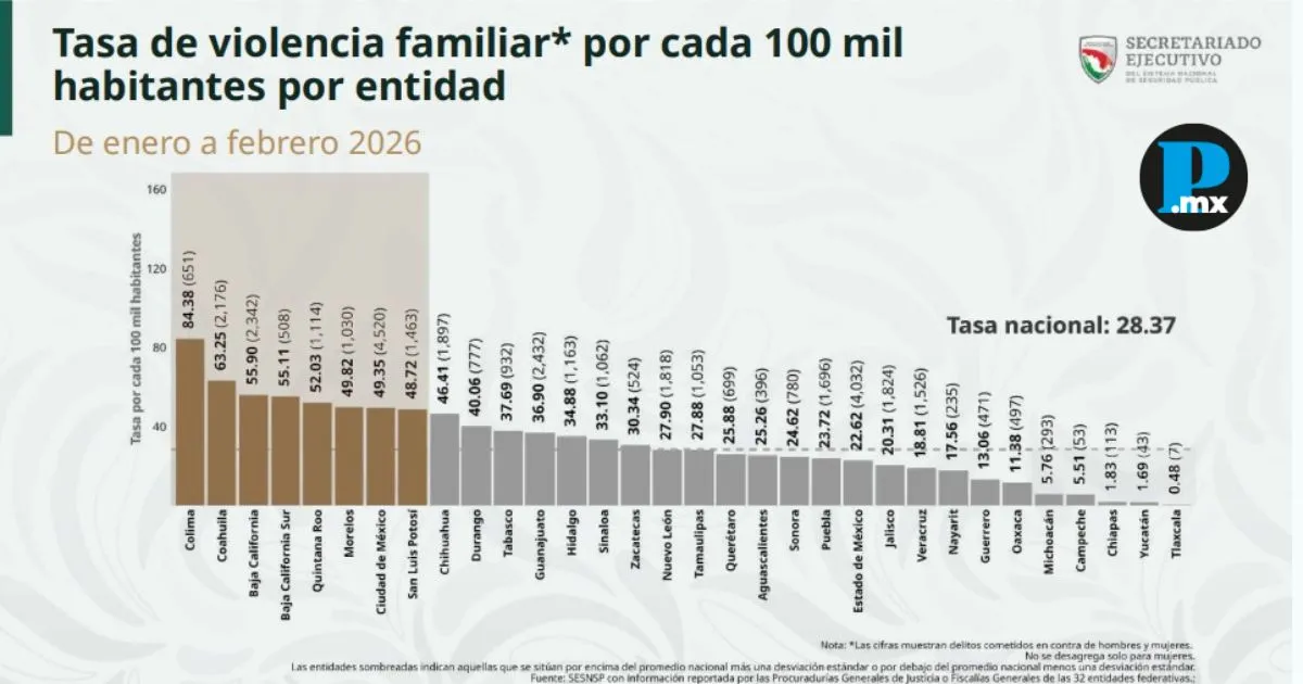 Durante enero y febrero de 2026, el estado de Puebla acumuló mil 696 víctimas de violencia familiar, de acuerdo con registros del Secretariado Ejecutivo del Sistema Nacional de Seguridad Pública (Sesnsp).