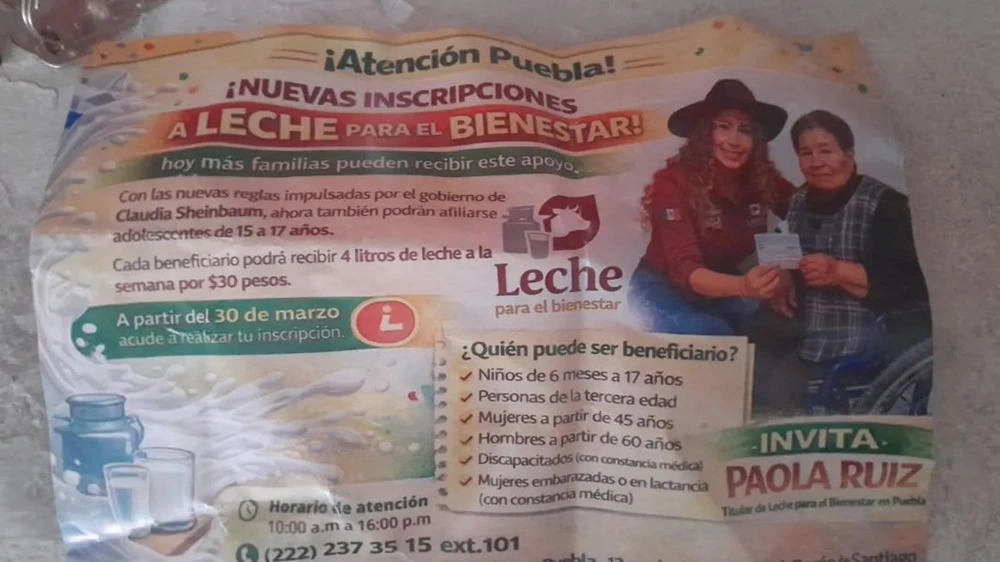 Se promociona con el Leche para el BienestarLa delegada de Leche para el Bienestar (Liconsa), Paola Ruiz García, promociona su imagen en folletos que reparte en eventos públicos, como en la Feria de la Gordita 2026 en la junta auxiliar de La Resurrección, en Puebla capital. Más detalles: Paola Ruiz, delegada de Liconsa, se promociona en folletos rumbo al 2027