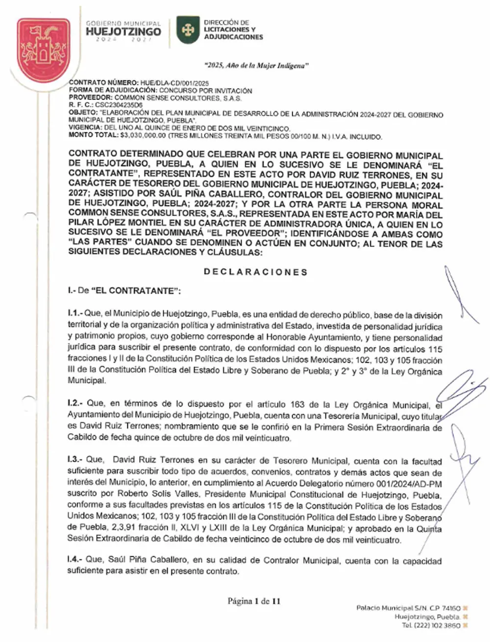 Huejotzingo pagó 3 millones 300 mil pesos para que una empresa elaborara en 17 días el Plan Municipal de Desarrollo (PMD) del gobierno de Roberto Solís Valles, lo cual implicó un gasto superior en comparación con lo invertido por municipios cercanos como San Martín Texmelucan, Coronango o Cuautlancingo, donde no se utilizaron recursos públicos; de acuerdo con una revisión al contrato HUE/DLA-CD/001/2025 y a información que solicitó El Popular vía solicitud de información (Folio 210430325000070 y 210431025000101). También puedes leer: SCJN invalida cobro de la Ley de Ingresos de Huejotzingo 2026 A diferencia de Huejotzingo, cuyo PMD costó 3.3 millones de pesos, el de San Martín Texmelucan —gobernado por Juan Manuel Alonso Ramírez— se elaboró con 823 mil 600 pesos, es decir, una diferencia de más de 2.4 millones de pesos.