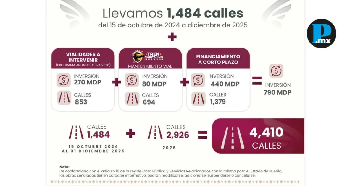 De octubre de 2024 a diciembre de 2025 ya se habían intervenido 1 mil 484 calles, por lo que al concluir este año se habrán entregado un total de 4 mil 410 calles renovadas a la ciudadanía. El paquete de obras incluye acciones en las 17 juntas auxiliares, priorizando vialidades que conectan planteles educativos, hospitales, zonas habitacionales, espacios religiosos, deportivos y rutas de transporte público. Te puede interesar: Ayuntamiento de Puebla intervino mil 480 calles en 2025 El Gobierno de la Ciudad mantiene además la campaña BacheAndo Puebla, con la atención de 371 mil baches mediante el despliegue de 25 cuadrillas en distintas zonas del municipio. Con la implementación de #CallesAl100, la administración municipal refrenda su compromiso con el fortalecimiento de la infraestructura vial y la mejora de la movilidad urbana en Puebla Capital.