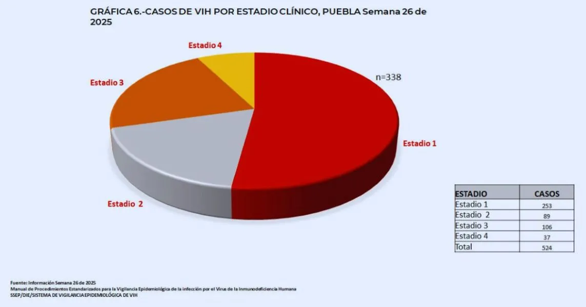 El Informe Histórico de VIH 3er Trimestre 2025 señala que, hasta septiembre de este año, se han reportado 322 casos de VIH en la entidad ¿Qué dicen los datos estatales?En contraste con los datos federales, el Panorama Epidemiológico de VIH del Estado de Puebla —con información de la Secretaría de Salud estatal— reporta cifras más elevadas para este año. Hasta el 28 de junio, en la entidad se han contabilizado 524 casos de VIH. Según el documento, 253 corresponden al Estadio 1, 89 al Estadio 2, 106 al Estadio 3 y 37 al Estadio 4. Estas cifras suman apenas 485 casos desglosados por estadio. El reporte estatal también identifica una mayor concentración de casos en municipios específicos. Puebla capital registra 244 contagios; San Pedro Cholula, 32; Huejotzingo, 16; San Andrés Cholula, 15; y Atlixco, 13. Además, señala que 99.42 por ciento de los casos detectados (521) en lo que va del año se relacionan con transmisión sexual y 0.57 por ciento (3) por transferencia perinatal. En materia de atención, autoridades estatales informaron que se fortalecieron las acciones de coordinación para la prevención y control del VIH/Sida.