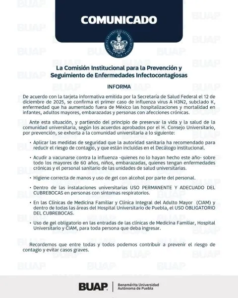 La Benemérita Universidad Autónoma de Puebla (BUAP) anunció el refuerzo de medidas sanitarias dentro de sus instalaciones, luego de que la Secretaría de Salud Federal confirmó el primer caso de influenza A H3N2, subclado K, registrado en el país el pasado 12 de diciembre de 2025. A través de un comunicado, la institución universitaria informó que este subtipo del virus ha provocado un incremento en hospitalizaciones y mortalidad en otros países, particularmente entre infantes, adultos mayores, mujeres embarazadas y personas con enfermedades crónicas, por lo que decidió aplicar acciones preventivas para proteger a su comunidad. Entre las medidas anunciadas destaca el uso permanente y adecuado de cubrebocas para personas que presenten síntomas respiratorios dentro de las instalaciones universitarias, así como su uso obligatorio en todas las áreas del Hospital Universitario de Puebla, las Clínicas de Medicina Familiar y la Clínica Integral del Adulto Mayor (CIAM).