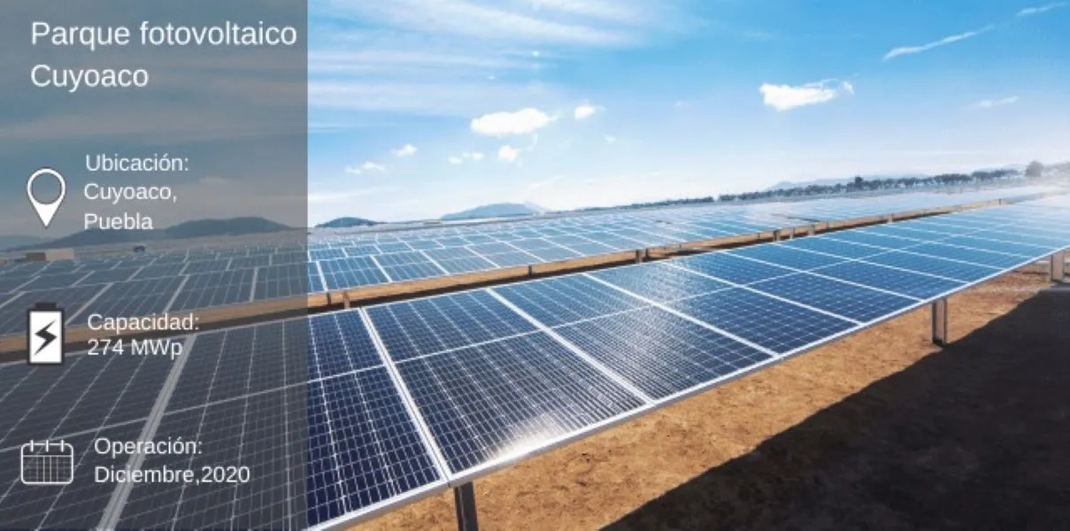 Energía solar (fotovoltaica)Puebla cuenta con importantes proyectos fotovoltaicos. Un caso representativo es la Planta Solar Cuyoaco, ubicada en ese municipio, la cual entró en operación en diciembre de 2020 y se convirtió en el tercer parque solar de este tipo en México desarrollado por Iberdrola. De acuerdo con su página oficial, cuentan con más de 730 mil paneles solares, una capacidad de 274 MWp (megavatios pico) y tiene una superficie de más de 703 hectáreas.