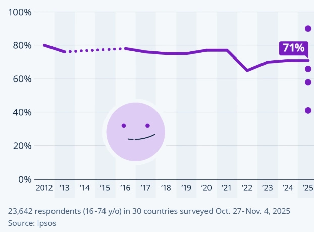 La mayoría de los encuestados a nivel global se declaran optimistas de que el próximo año será mejor que el actual, según un análisis de datos de Statista basado en una encuesta internacional realizada por Ipsos a finales de 2025. El estudio abarcó a poblaciones adultas de múltiples países y midió la percepción general sobre cómo será el año venidero en comparación con el que termina. De acuerdo con los resultados, un promedio del 71 % de los participantes se muestra optimista de que el siguiente año será mejor que el actual, cifra que indica una tendencia de esperanza a pesar de desafíos globales como crisis económicas, conflictos y otros factores inciertos que afectan la percepción pública.