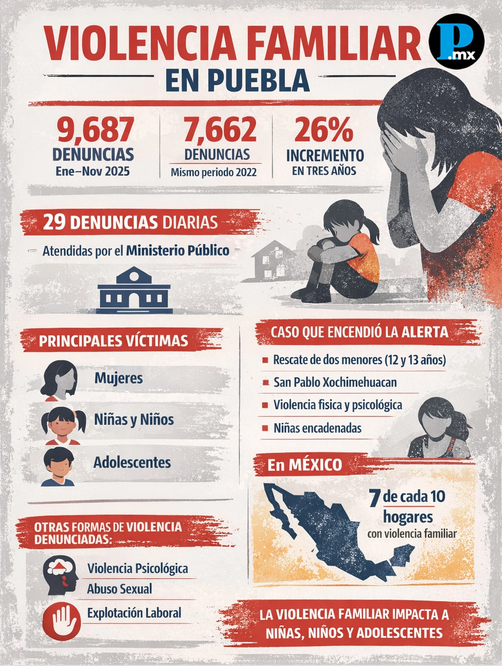 Entre enero y noviembre de 2025 se registraron 9 mil 687 denuncias por violencia familiar en el estado de Puebla, frente a las 7 mil 662 reportadas en el mismo periodo de 2022, lo que representa un incremento del 26 por ciento en tres años. De acuerdo a datos oficiales, durante el último año, las agencias del Ministerio Público atendieron en promedio 29 denuncias diarias relacionadas con agresiones ocurridas al interior del hogar. La mayoría de los casos involucran a mujeres, niñas, niños y adolescentes, quienes concentran el mayor número de reportes. El fenómeno volvió a la atención pública tras el rescate de dos menores de 12 y 13 años en la junta auxiliar de San Pablo Xochimehuacan, donde autoridades documentaron un contexto de violencia física y psicológica, además de tratos degradantes. De acuerdo con información oficial, las niñas permanecían encadenadas y el presunto responsable es buscado por las autoridades.