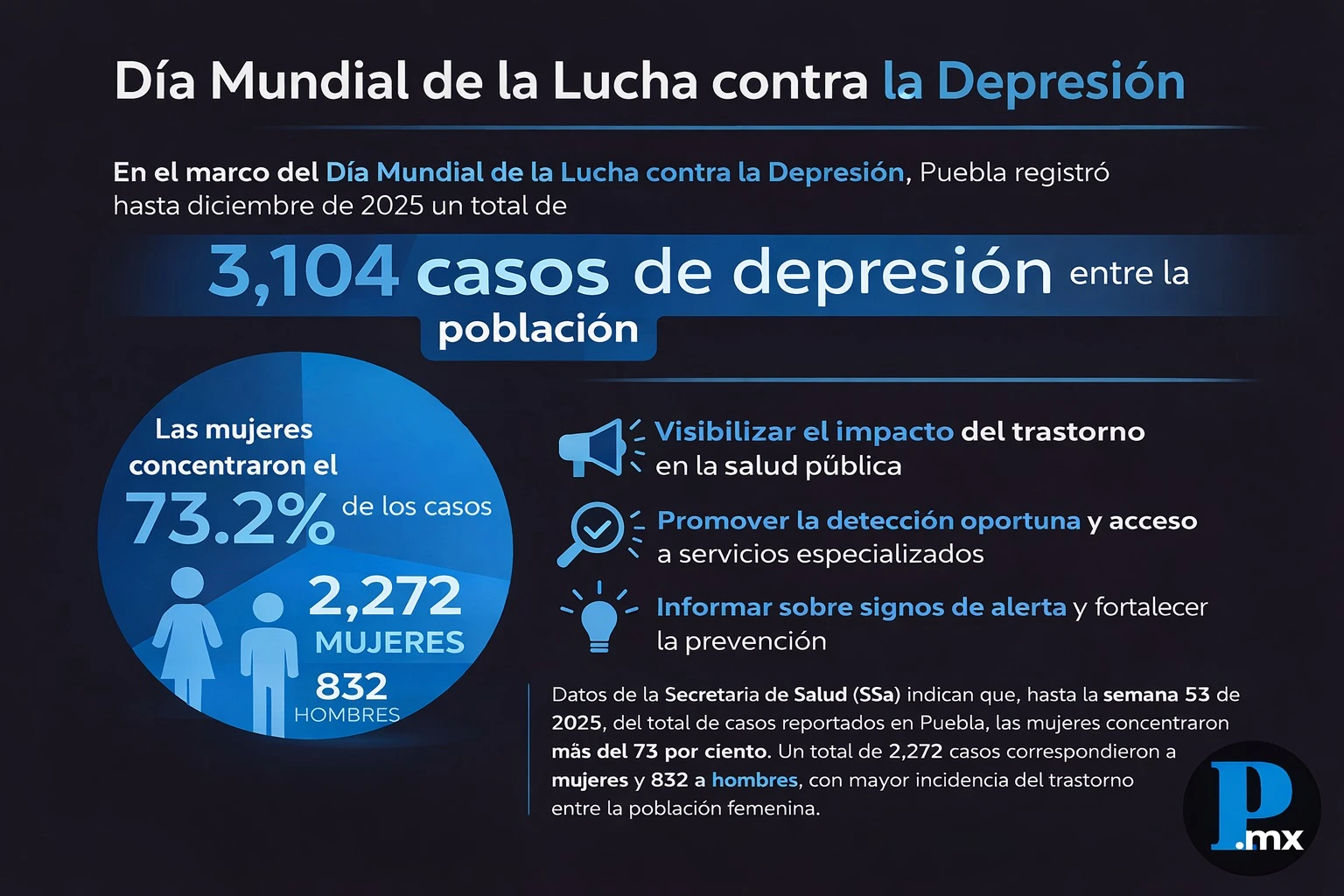 En el marco del Día Mundial de la Lucha contra la Depresión, el estado de Puebla registró, hasta diciembre de 2025, un total de 3 mil 104 casos de depresión entre la población, de acuerdo con el último reporte del Sistema de Vigilancia Epidemiológica, correspondiente a la semana 53. Del total de casos, 2 mil 272 correspondieron a mujeres y 832 a hombres, con una mayor incidencia del trastorno entre la población femenina. Datos de la Secretaría de Salud (SSa) recabados durante 2025 indican que las mujeres concentraron el 73.2 por ciento de los casos atendidos por el organismo de salud en la entidad.