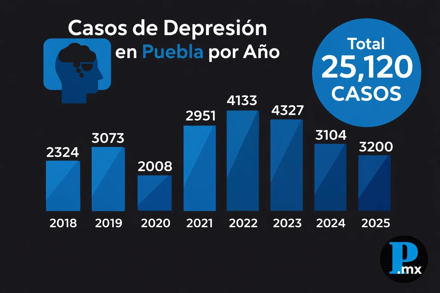En los últimos ocho años, 25 mil 120 personas en Puebla han sido diagnosticadas con depresión, una de las principales enfermedades que provocan sentimientos de inutilidad, ideación de panoramas catastróficos, y que, si no es tratada, puede derivar en suicidio, según la Organización Mundial de la Salud (OMS). La cifra de 25 mil 120 personas diagnosticadas proviene de las consultas realizadas por la Secretaría de Salud entre 2018 y 2025, de acuerdo con una revisión de El Popular, Periodismo con Causa, a diversas publicaciones del Boletín Epidemiológico del Sistema Nacional de Vigilancia Epidemiológica. En 2018, dos años antes de la pandemia, en Puebla se registraron 2 mil 324 casos de depresión; en 2019 la cifra aumentó en 749 pacientes, para un total de 3 mil 73 personas con síntomas como tristeza, decaimiento y pérdida de interés en actividades placenteras, según el Consejo Nacional para el Desarrollo y la Inclusión de las Personas con Discapacidad. La cifra tuvo una disminución en 2020, cuando, a causa de la pandemia, la atención médica se priorizó para tratar los casos de coronavirus, por lo que sólo se documentaron 2 mil 8 casos. A partir de 2021, los registros volvieron a incrementarse, con 2 mil 951 casos, hasta alcanzar 4 mil 133 en 2022 y un máximo de 4 mil 327 en 2023. Aunque en 2024 y 2025 se observa una baja respecto a ese pico, los niveles se mantienen elevados en comparación con los registrados entre 2018 y 2020. |