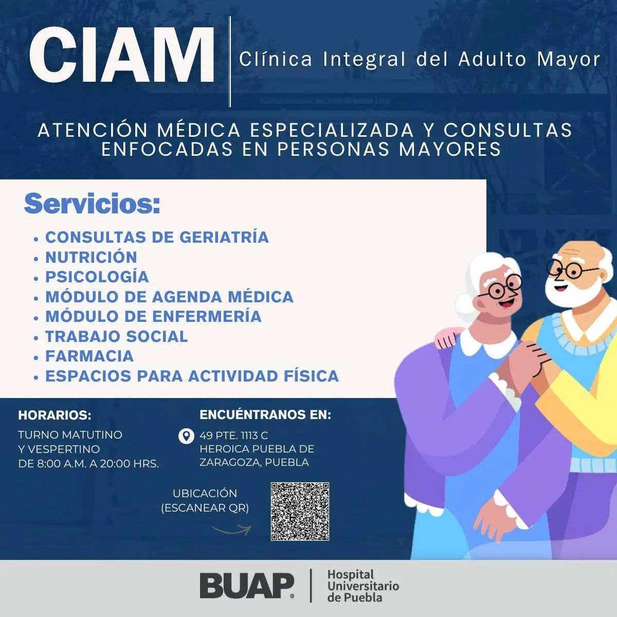 La atención se brinda en turno matutino de 7:00 a 15:00 horas y turno vespertino de 12:00 a 20:00 horas, para facilitar el acceso según las necesidades de cada persona. En el primer piso se localizan los consultorios de fisioterapia, rehabilitación y nutrición, reforzando el carácter integral del servicio. Toda persona atendida en la CIAM puede acceder a estos servicios como parte de su tratamiento, siempre con acompañamiento profesional. La Clínica Integral del Adulto Mayor de la BUAP es un espacio pensado para escuchar, acompañar y cuidar, donde la atención médica se brinda con respeto, calidez y enfoque humano, reconociendo la experiencia de vida y los derechos de las personas mayores.
