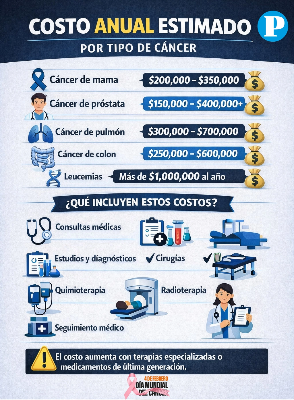 Un tratamiento anual para tratar el cáncer en Puebla representa un alto costo económico, especialmente cuando se atiende en el sector privado o sin cobertura institucional. Entre los cánceres más comunes en la entidad se encuentran el cáncer de mama, próstata, pulmón, colon, leucemia y cáncer cervicouterino u ovárico. De acuerdo con estimaciones de especialistas, reportes del sector salud, así como una revisión hemerográfica, el tratamiento anual del cáncer de mama puede oscilar entre 200 mil y 350 mil pesos. Te puede interesar: ¿Cuánto cuestan los medicamentos contra el cáncer? En tanto, el atender un cáncer de próstata puede representar una inversión de entre 150 mil y más de 400 mil pesos; mientras que el cáncer de pulmón puede superar los 300 mil y llegar hasta 700 mil pesos al año. En el caso del cáncer de colon, los costos van de 250 mil a 600 mil pesos, y para leucemias los montos pueden rebasar el millón de pesos anual, debido a la duración del tratamiento y al costo de los medicamentos. Estas cifras incluyen consultas, estudios, cirugías, quimioterapia, radioterapia y seguimiento médico. Es importante señalar que los montos pueden incrementarse si se requieren terapias especializadas o medicamentos de última generación.