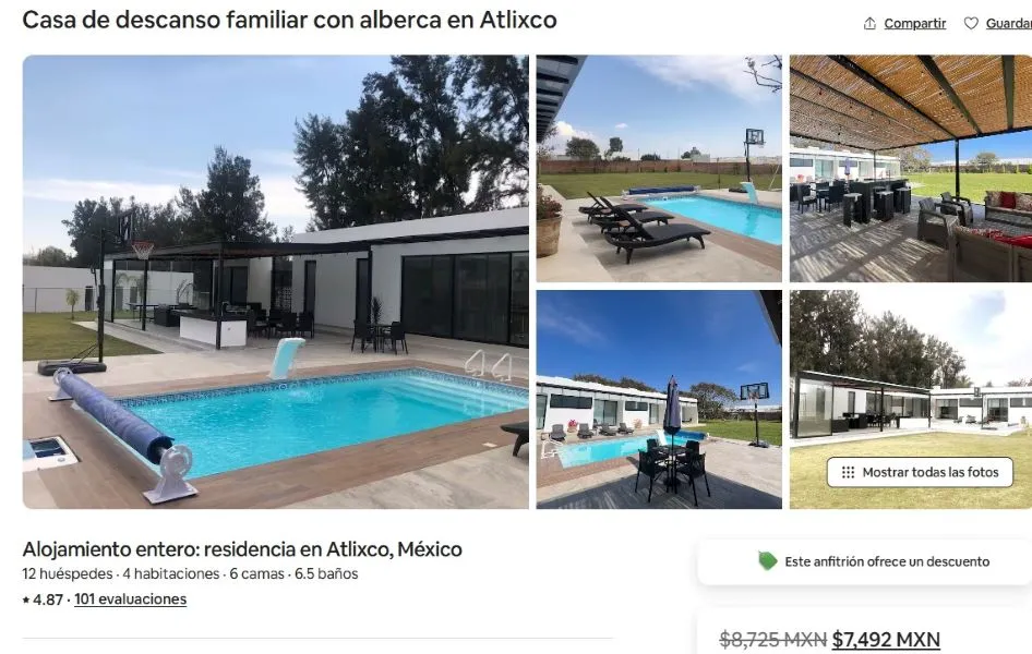 A continuación, te mostramos los alquileres más caros que existen en los diferentes Pueblos Mágicos del estado de Puebla. * San Andrés Cholula: De $1,500 a $2,500 por una sola noche. * San Pedro Cholula: De $1,500 a $2,200 con un máximo de 3 recámaras y estadía de un solo día. * Atlixco: Los espacios disponibles pueden alcanzar hasta $7,500 pesos por una noche en pequeñas cabañas, algunas de ellas con piscina, clima o áreas de juegos. Los alojamientos cuentan con estadías de un solo día y de una a tres recámaras. * Chignahuapan: De $1,500 a $2,500 por una sola noche; los hospedajes cuentan con una o dos habitaciones. * Cuetzalan: Es otro de los Pueblos Mágicos donde las habitaciones pueden alcanzar, desde $2,200 pesos hasta $7,500, con estadías de un día. * Huauchinango: De $2,000 a $9,000 por un solo día; el alquiler más caro cuenta con 4 habitaciones.