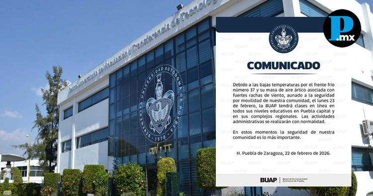 La Benemérita Universidad Autónoma de Puebla (BUAP) anunció que este lunes 23 de febrero las clases se impartirán en modalidad en línea en todos sus niveles educativos, tanto en la capital poblana como en sus complejos regionales. También puedes leer: Narcobloqueos afectan tránsito en autopistas México-Puebla y Veracruz La decisión responde a las bajas temperaturas provocadas por el frente frío número 37 y su masa de aire ártico, que genera fuertes rachas de viento en la entidad. Aunado, señala la institución, "garantizar la seguridad por movilidad de nuestra comunidad". La institución precisó que las actividades administrativas se mantendrán de manera normal. En el comunicado emitido este 22 de febrero, la universidad subrayó que la seguridad de su comunidad es la prioridad ante las condiciones climatológicas adversas y el escenario de inseguridad en las carreteras del país. El frente frío número 37 se desplaza sobre el territorio nacional acompañado de una masa de aire ártico, lo que ha provocado descenso significativo de temperatura, rachas fuertes de viento y posibles heladas en zonas altas del centro del país, incluido Puebla. Tras la detención de Rubén Oseguera Cervantes, líder del Cártel Jalisco Nueva Generación, se registraron narcobloqueos y quema de vehículos en distintos puntos del país, incluyendo tramos carreteros estratégicos. Estas acciones, atribuidas a células del grupo criminal, buscaron generar presión y desestabilización mediante el cierre de vialidades y la intimidación a la población. En Puebla, se reportaron incidentes en autopistas y vías federales que afectaron la movilidad, particularmente en conexiones clave hacia la Ciudad de México y el centro del país. Las autoridades desplegaron operativos de seguridad para restablecer el tránsito y garantizar la integridad de los ciudadanos. |