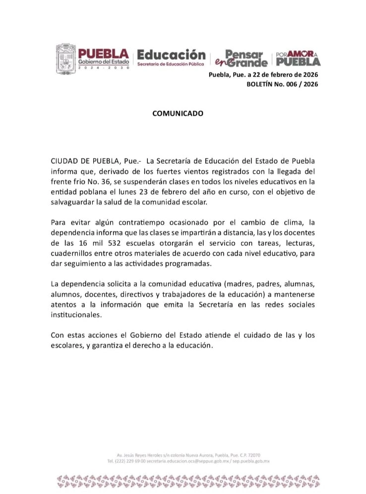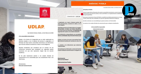 Ante el contexto de violencia registrado en distintos puntos del país y del estado, así como por las condiciones climatológicas provocadas por el frente frío número 36, diversas universidades privadas y autoridades educativas en Puebla anunciaron la cancelación de clases presenciales para este lunes 23 de febrero. También puedes leer: Vuelos y autobuses cancelados por bloqueos e inseguridad tras muerte de “El Mencho” La UDLAP informó que la asistencia a clases no será obligatoria y que no habrá sanciones académicas para quienes decidan no acudir. Por su parte, la Universidad Anáhuac Puebla implementará modalidades híbridas en las materias que lo permitan, permitiendo que estudiantes foráneos o quienes se encuentren fuera de la ciudad tomen clases a distancia. En tanto, la Universidad Iberoamericana Puebla determinó la suspensión total de actividades académicas presenciales en todos sus niveles educativos, trasladando las clases a modalidad virtual cuando sea posible, mientras que las labores administrativas continuarán de manera presencial. A nivel estatal, la Secretaría de Educación del Gobierno de Puebla anunció la suspensión de clases presenciales en todos los niveles educativos de la entidad, señalando que las actividades se desarrollarán a distancia para salvaguardar la salud y seguridad de la comunidad escolar.