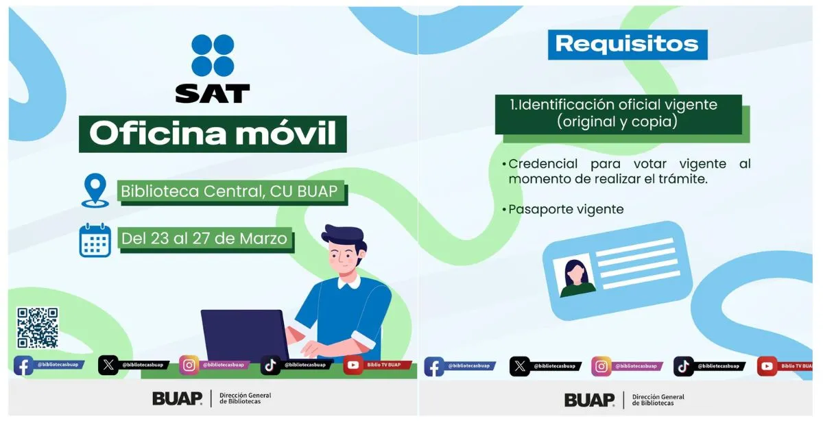 La oficina móvil del SAT llegará a la BUAP para atender trámites fiscales de estudiantes en la Biblioteca Central. La oficina se ubicará dentro de la Biblioteca Central Universitaria, operando del 23 al 27 de marzo en un horario de 9:00 de la mañana a 4:45 de la tarde, del mismo modo, para acceder a los servicios, el estudiantado deberá de presentar los siguientes documentos: