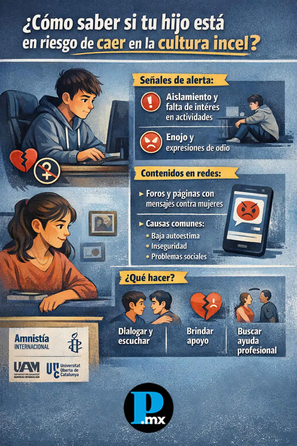 El término incel —“célibe involuntario”— se utiliza para describir a personas que sienten que no pueden tener relaciones afectivas o de pareja. En internet, algunas comunidades han llevado esta idea hacia discursos de enojo, rechazo y odio, principalmente contra las mujeres, lo que ha sido analizado por organismos como Amnistía Internacional y diversas universidades. También puedes leer: Estos son los casos recientes de violencia incel en escuelas de México y Latinoamérica Especialistas en salud mental advierten que no todos los jóvenes con dificultades sociales forman parte de la cultura incel, pero sí existen señales que madres y padres pueden observar. Una de las principales es el aislamiento, cuando el adolescente deja de convivir, se encierra por largos periodos o pierde interés en actividades que antes disfrutaba.