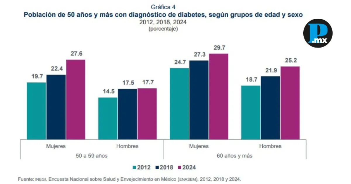 De acuerdo con la Encuesta Nacional sobre Salud y Envejecimiento en México (ENASEM) 2024, en el país hay 32 millones de personas de 50 años y más, lo que refleja el incremento de este grupo poblacional y su peso en la estructura demográfica nacional. Del total, 52.8 % son mujeres y 47.2 % hombres; además, esta tendencia también se observa en condiciones como la viudez, donde 22.6 % de las mujeres se encuentra en esta situación frente a 7.3 % de los hombres, lo que marca una diferencia en las condiciones de vida durante la vejez. El informe identificó las brechas de género en las labores de cuidado, pues en 2024, 35 % de las personas de 50 años y más brindaba atención a menores o personas enfermas; sin embargo, la proporción fue mayor entre mujeres, con 43.8 %, frente a 25.1 % en hombres. En materia de salud, la población envejecida enfrenta una alta prevalencia de enfermedades crónicas. El 41.5 % vive con hipertensión y el 25.5 % con diabetes, padecimientos que aumentan con la edad y presentan mayores niveles en mujeres.