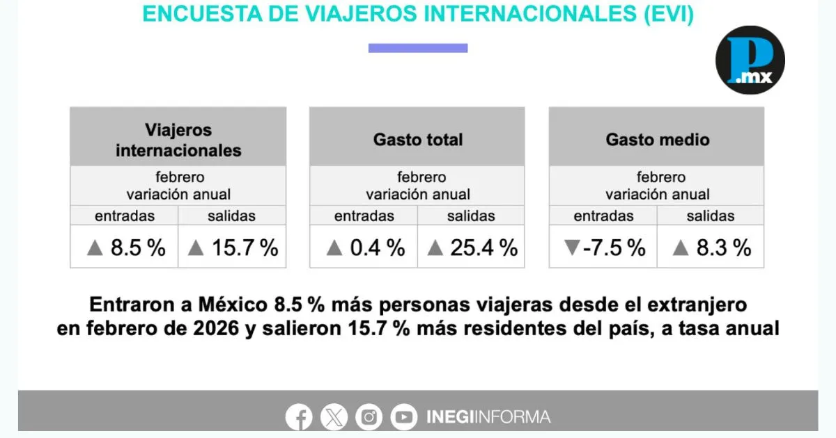 México recibió 8 millones 012 mil 213 visitantes internacionales durante febrero de 2026, lo que representó un incremento de 8.5% respecto al mismo mes del año anterior, de acuerdo con la Encuesta de Viajeros Internacionales (EVI) difundida por el Instituto Nacional de Estadística y Geografía. Del total de visitantes, 3 millones 880 mil 812 personas (48.4%) fueron turistas internacionales, es decir, viajeros que pernoctaron en el país, mientras que el resto correspondió a excursionistas. En el mismo periodo, se reportó un aumento de 15.7% en las salidas de residentes mexicanos al extranjero, acompañado de un incremento de 25.4% en el gasto total realizado por estos viajeros.