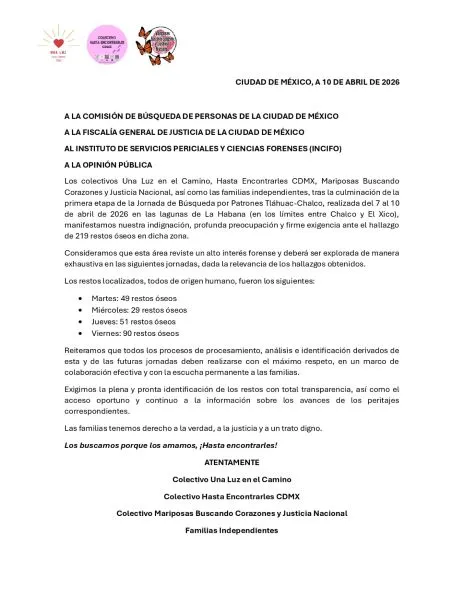 Comunicado / Hasta Encontrarles CDMX Asimismo, solicitaron que las autoridades realicen procesos de análisis e identificación con claridad, transparencia y acceso a la información para las familias. También enfatizaron que los procedimientos deben desarrollarse con respeto y en un marco de colaboración que incluya la participación de las familias. “Exigimos la plena y pronta identificación de los restos con total transparencia, así como el acceso oportuno y continuo a la información sobre los avances de los peritajes correspondientes. Las familias tenemos derecho a la verdad a la justicia y a un trato digno”, culmina el documento.