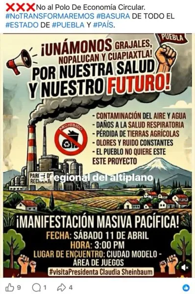 Pobladores de San José Chiapa convocaron a una protesta pacífica durante la visita de la presidenta de México, Claudia Sheinbaum Pardo, para manifestar su rechazo a la instalación del Polo de Economía Circular. La convocatoria circuló en redes sociales, en la cual también se invita a pobladores de los municipios de Rafael Lara Grajales, Nopalucan y Cuapiaxtla a manifestarse este sábado 11 de abril en Ciudad Modelo, ubicada en San José Chiapa, donde a las 16:15 horas la mandataria encabezará el Programa de Vivienda para el Bienestar. Te puede interesar: Polo de Economía Circular en San José Chiapa no afectará ejidos: Sheinbaum