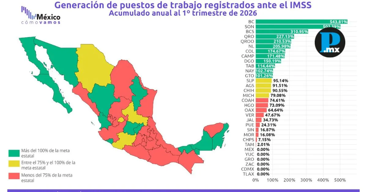 De acuerdo con el observatorio México ¿Cómo Vamos?, Puebla no alcanzó el 75% de su meta estatal, umbral mínimo para una evaluación favorable. A nivel nacional, solo 12 entidades cumplieron sus objetivos, mientras que 16 —incluida Puebla— se ubicaron por debajo. En el municipio de Puebla capital, entre febrero y marzo, se generaron 2 mil 484 empleos, de los cuales 2 mil 391 fueron permanentes. Este desempeño posicionó a la capital como la cuarta del país con mayor creación de puestos en marzo, impulsada principalmente por los sectores de construcción y servicios para empresas y hogares. Al cierre del mes, el municipio sumó 335 mil 375 trabajadores afiliados al IMSS. Te puede interesar: Puebla, cuarta capital con más empleo formal en México: IMSS El empleo formal a nivel nacionalA nivel nacional, la generación de empleo formal también mostró señales de desaceleración. Durante el primer trimestre de 2026 se crearon 207,604 puestos de trabajo, de los cuales el 83.1% fueron permanentes. Esta cifra es 8.4% menor a la del mismo periodo de 2025 y representa el arranque más bajo para un primer trimestre desde 2005, excluyendo años de crisis. Al 31 de marzo, el total de empleos registrados ante el IMSS en el país fue de 22,724,680, con un crecimiento anual de 1.2%. No obstante, la meta de generar alrededor de 300 mil empleos trimestrales —equivalente a 100 mil mensuales— no se cumplió, por lo que el Semáforo Económico Nacional se mantiene en rojo. Entre las entidades con mejor desempeño respecto a sus metas destacan Baja California, Sonora, Baja California Sur, Querétaro y Quintana Roo. En contraste, seis estados reportaron pérdida de empleos netos, con la Ciudad de México como la entidad con mayor caída. El balance del periodo muestra que, pese al crecimiento anual del empleo formal, la creación de nuevos puestos se ha desacelerado en el inicio de 2026. |