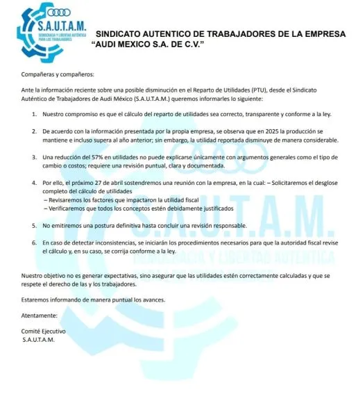 El Sindicato Auténtico de Trabajadores de Audi México (SAUTAM) exigió a la empresa aclarar una caída del 57 por ciento en las utilidades reportadas para 2025, pese a mantener o incluso aumentar su producción. Señaló que esta disparidad podría impactar directamente en el ingreso de cientos de empleadxs, debido a una posible reducción en esta prestación. En un comunicado, solicitó el desglose completo del cálculo, para que cada trabajadora y trabajador pueda revisar los factores de utilidad fiscal y verificar las justificaciones de la posible disminución en el Reparto de Utilidades (PTU). Te puede interesar: Armenta respalda a Audi y Volkswagen ante rumores de traslado de producción El Comité Ejecutivo del SAUTAM señaló que, a pesar de que la producción de 2025 se mantiene o supera a la del año anterior, la utilidad reportada disminuyó un 57 por ciento, situación que preocupa a las y los afiliados.
