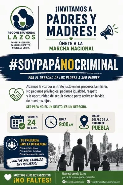 Puebla se sumará este viernes a la marcha nacional #SoyPapáNoCriminal, una movilización que busca visibilizar demandas relacionadas con los procesos familiares y el derecho de convivencia entre madres, padres e hijos. De acuerdo con los organizadores, el movimiento “Soy papá, no criminal” tiene como objetivo exigir igualdad en los procesos legales familiares, así como evidenciar casos en los que padres han sido separados de sus hijos de manera injusta. Te puede interesar: Ineficacia en cobro de pensiones detona iniciativa para frenar deudores en Puebla Entre las situaciones que se pretenden visibilizar se encuentran señalamientos derivados de denuncias falsas y otros conflictos legales que han derivado en la pérdida de convivencia. En el caso de Puebla, la convocatoria establece que la concentración iniciará a las 09:00 horas en el Zócalo de Puebla, en el Centro Histórico de la capital.