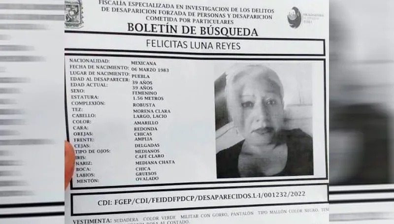La mujer fue vista por última vez el 29 de octubre cuando salió de su trabajo en la calle San Mateo, Lote 3 de la colonia La Venta en Amozoc, así lo indica la ficha de localización emitida por la Fiscalía Especializada en Investigación de los Delitos de Desaparición Forzada de Personas y Desaparición Cometida por Particulares bajo la carpeta 001232/2022.